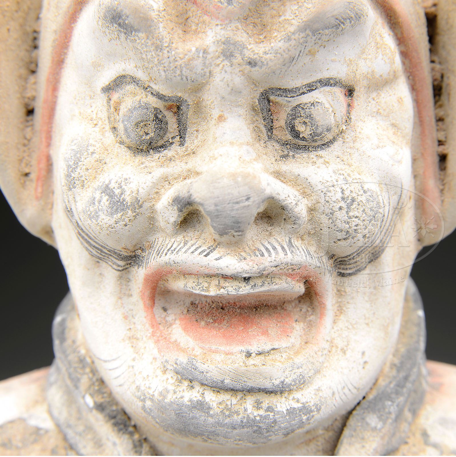PAIR OF GUARDIAN BURIAL FIGURES. Tang Period (618-920), China. Loka pala figures of warriors in armor. Traces of polychrome detail remaining. SIZE: 25″ h. PROVENANCE: From a private New York State collection. CONDITION: Very good with wear appropriate with age. 9-92409 (1,200-1,500)