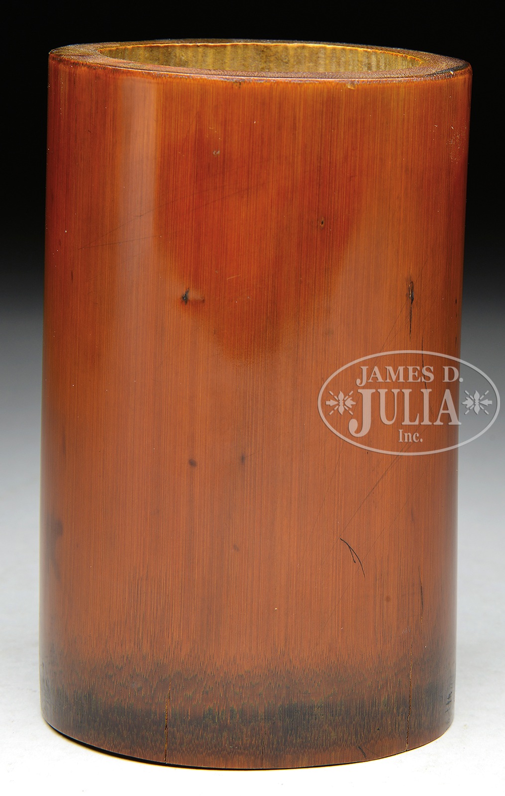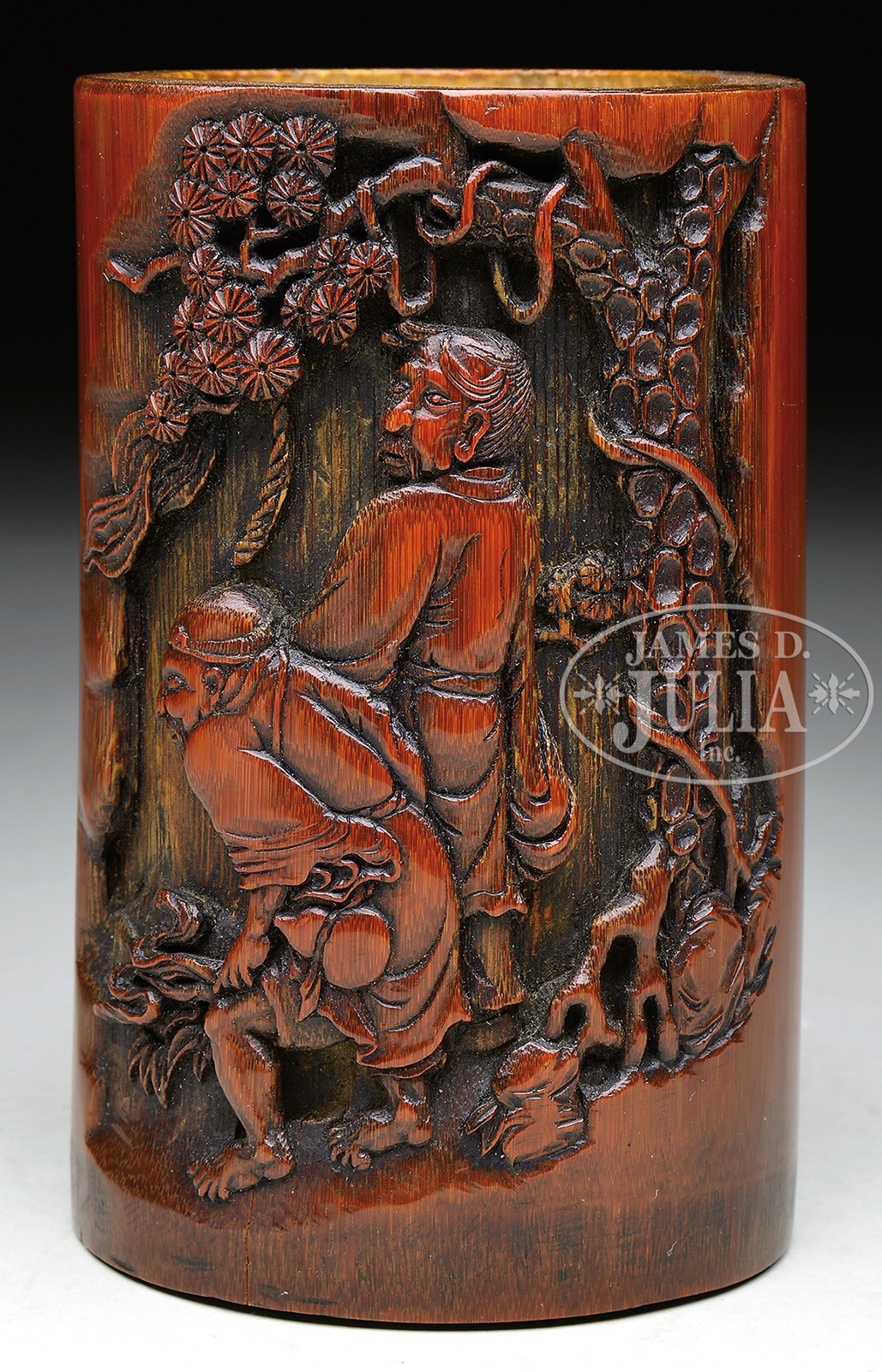 BAMBOO BRUSH POT.19th century, China. Scene of two figures carved in high relief in a pine grove. SIZE: 5-1/2″ h. CONDITION: Very good. 9-91362 (700-900) – Lot 4277
