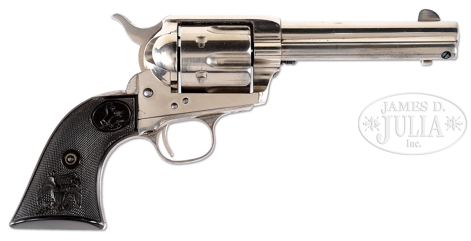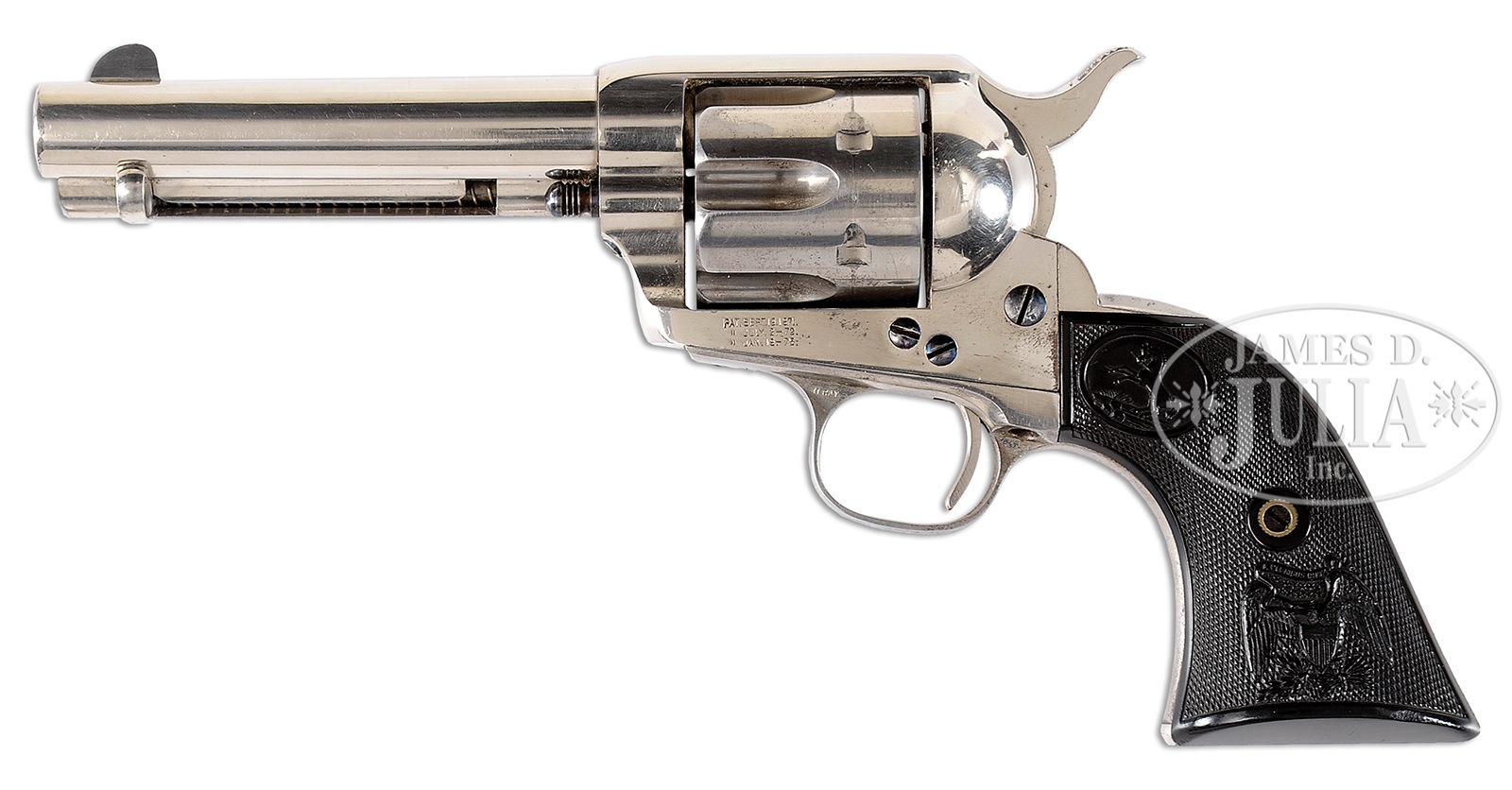 COLT SINGLE ACTION ARMY REVOLVER WITH FULL NICKLE FINISH AND HARD RUBBER “EAGLE” TWO PIECE HARD RUBBER GRIPS.SN 124837. Cal. 41LC. 4-3/4″ bbl. Nickel finish with blue screws and cyl base pin. Bbl shows correct 2-line address on top and 41CAL on bottom under the cyl base pin. Ejector rod housing was not removed. Housing fits perfectly. Frame shows the correct 3-line patent mark on the forward left side. Forward left trigger guard bow is stamped “41CAL”. SN matches on frame, trigger guard and backstrap. Cyl has a small “S” stamped on the rear face between the chambers, and is otherwise unmarked. Right grip is marked in pencil on bottom with the last 4-digits of SN. Left grip is not marked. CONDITION: Fine to very fine. Bbl retains 90% plus, of the somewhat dulling nickle finish, with slight muzzle wear and a few small scratches overall. Some very light cleaning marks are evident. Front sight is full-sized. Bbl markings are sharp and clear. Bbl index mark is perfectly aligned. Bore is somewhat frosty with sharp rifling. Frame retains 90% orig nickel finish with some evidence of light cleaning at the rear. Patent mark is sharp and crisp. Loading gate shows some wear on outer edge. Backstrap shows 80% orig nickel finish that is thinning on the apron, and along the right side. SN mark is sharp and clear. Trigger guard retains 80% plus orig nickel finish with sharp and clear SN mark and cal mark. Trigger guard also shows evidence of some light cleaning. Hammer retains nearly all orig nickel finish, with scratch marks on both sides. Frame screws retain a considerable amount of their fire-blue finish. As do the trigger guard and backstrap screws. Bolt screw is slightly marred, as are backstrap screws on either side of hammer. Trigger retains nearly all orig nickel finish. Cyl retains 80-90% orig nickel finish, with some erosion on face, a slight drag-mark and some evidence of light cleaning. Cyl base pin and screw retain considerable fire-blue finish. Base pin screw is slightly marred. Hard rubber grips are fine with sharp checkering, clear Colt logo, and very crisp eagle motifs. Grip screw has a silver-gray patina. An opportunity to purchase a very fine Colt single action army revolver, manufactured in 1887 with a very desirable finish and grip combination. 50611-1 TEP (4,000-7,000) – Lot 4282 Click here to view provenance