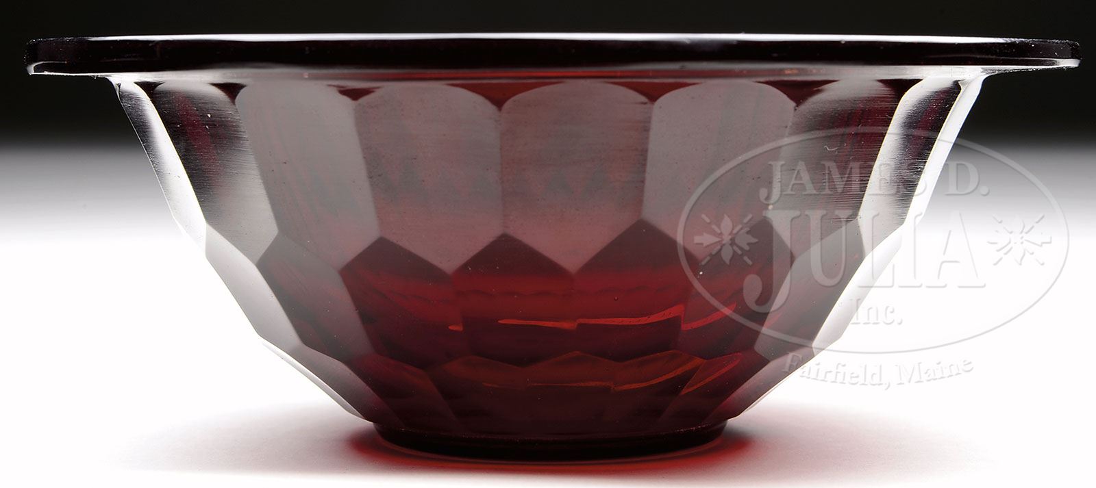 RED PEKING GLASS BOWL. 19th century, China. Bowl in transparent faceted red Peking glass. Three rows of facets decorate the outside of the bowl and have been well polished. A reign mark has been incised into the indented base and it is of the period. SIZE: 6-1/4″ w x 2-1/4″ t. CONDITION: Very good. 7-74512 (400-600)