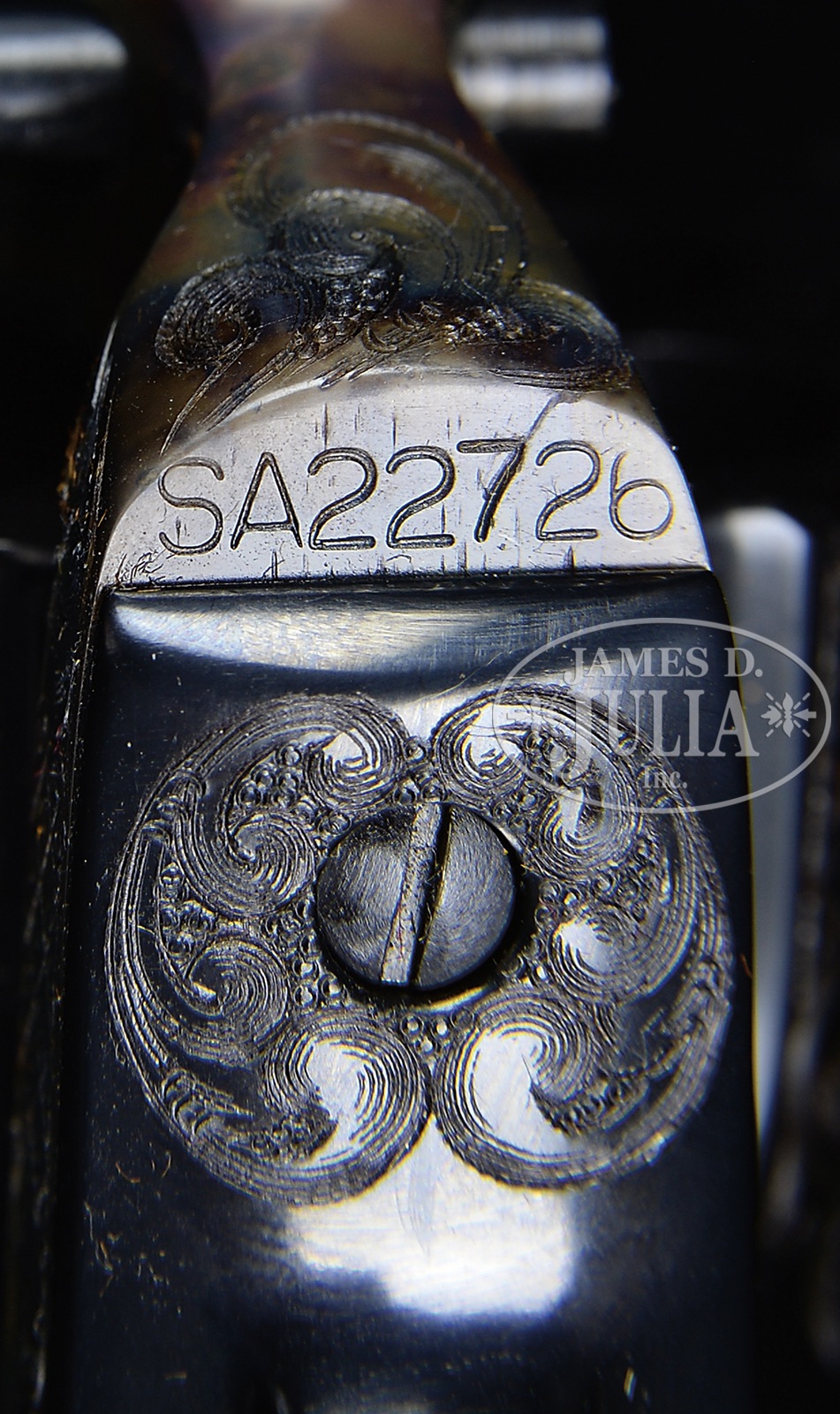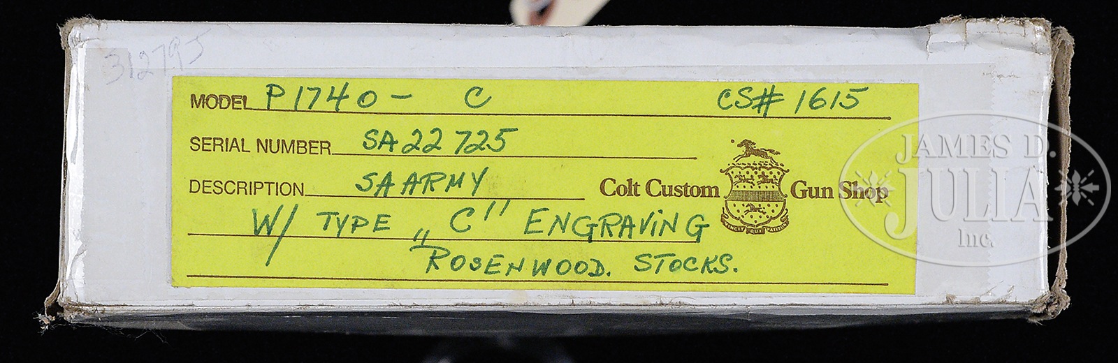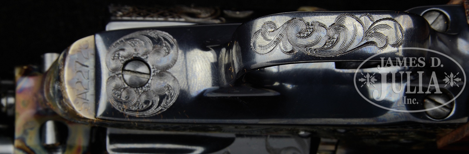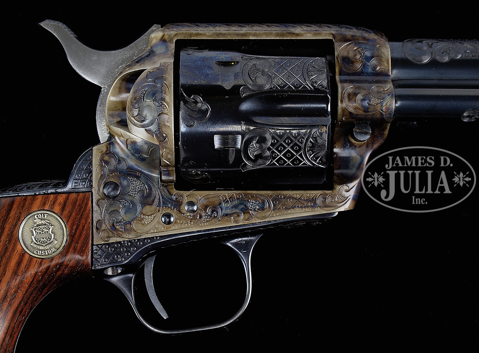*FRESH TO MARKET, SPECTACULAR, EXCEEDINGLY RARE CONSECUTIVELY NUMBERED PAIR OF EARLY THIRD GENERATION COLT FACTORY ENGRAVED SINGLE ACTION ARMY REVOLVERS IN 44 SPECIAL CALIBER WITH EQUALLY RARE FACTORY ROSEWOOD GRIPS WITH COLT FACTORY INLAID MEDALLIONS.SN SA22725/SA22726. Cal. 44 Special 4-3/4″ bbls. Blue and case color finish. Exceedingly rare Colt Factory Rosewood Grips with inlaid medallions. Revolvers are flawlessly engraved with class “C” coverage. Barrels are beautifully engraved on both sides of address with a line and punch dot border, ending in scroll work on both ends, from breech to muzzle. Barrels are also engraved on left side below model and caliber mark, at breech and muzzle end. Ejector rod tubes are scroll engraved. Frames show remarkably unique scroll engraving on both sides with a line and punch dot pattern on the recoil shield on left side with a wonderful checkerboard accent. Loading gates are elaborately scroll engraved without border. Right side of frame has a checkerboard pattern accenting the engraving. Top of frames are decorated with a line and punch dot pattern matching the engraving on the barrels. Backstraps are engraved with line and punch dot checkerboard and scroll engraving. Butts and trigger guards are engraved with scroll. Rear flat of trigger guards and side flats of backstraps are engraved in a checkerboard pattern. In a very rarely seen manner the cylinders are spectacularly engraved in a scallop, checkerboard, and scroll pattern between the flutes. Rear of cyls have scroll accents between bolt stops. Bbls show 1-line bbl address on top. Model and cal mark on left side. SNs are stamped on bottom of forward flat of frame. 2-line patent mark with rampant Colt logos on left side of frames. Factory grips are made of Rosewood with Colt custom medallions inlaid at the top. Revolvers are each cased in a Colt Factory leatherette box and both revolvers also come with factory cardboard sleeves that have an end label describing the features of each revolver. In famed author Don Wilkerson’s book on pages #215, #221, and #223, Wilkerson details how the Colt Factory Records show that of Colt Factory Engraved Revolvers only 7% were manufactured in the 44 Special caliber, and only 9% of all Consecutive Sets were in the 44 Special caliber, and only 2% of all Colt Consecutive Serial Sets were manufactured with Factory Grips in a material other than “Eagle Stocks or Ivory Stocks”, making the Factory Rosewood Grips on this consecutive set exceedingly rare. OF NOTE: Elsewhere in this current James Julia auction, there are two (2) other equally rare and spectacular consecutive sets of Colt Factory Engraved Revolvers in Calibers 357 Magnum and 45 Caliber; also of note ALL THREE consecutive sets were originally shipped by the Colt Factory to the exact same address and the exact same collector Mr. William Winkelman of Merrill, Wisconsin approximately 35 years ago; ALL THREE consecutive sets are also consigned to this auction from the same Texas collector. This is a chance to own three consecutive sets of Colt Factory Engraved revolvers in three different calibers: 357 Magnum, 45 Caliber, and 44 Special. PROVENANCE: William Winkelman, Charles Layson, The Vince Sepulveda Collection, and a Colt Factory Archive Letter confirming all features and showing shipment as a consecutive set on October 1, 1982. CONDITION: As New. Un-fired. A super rare and highly collectible consecutive set of investment quality firearms. 50872-9 (9,500-18,500) C&R – Lot 4293 Click here to view provenance