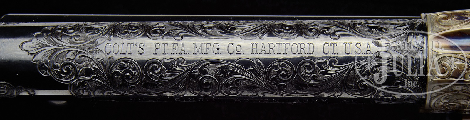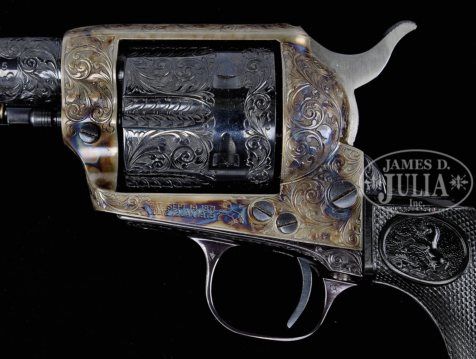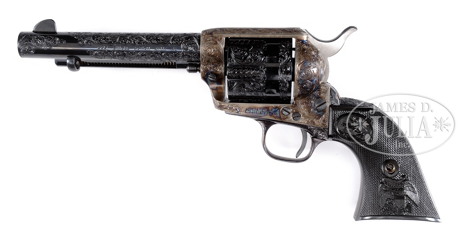 *FRESH TO MARKET, EXCEEDINGLY RARE AND SPECTACULAR FACTORY ENGRAVED COLT SECOND GENERATION SINGLE ACTION ARMY REVOLVER IN FULL “D” LEVEL COVERAGE WITH FACTORY EAGLE GRIPS.SN 70049SA. Cal. 45LC. 5-1/2″ bbl. Blue and case color finish. 2-pc Colt hard rubber grips with eagle motif. Revolver is Factory Engraved in full “D” level coverage engraving that may be the work of famed engraver Robert Burt who worked as a Colt factory engraver during time of manufacture. Bbl shows scroll engraving on both sides of address and extending toward the front sight. Both sides of muzzle are beautifully engraved with scroll. Bottom of model and cal mark is also bordered by scroll engraving. Frame is flawlessly scroll engraved with nearly full coverage overall. Backstrap is scroll engraved on entire length. Butt is engraved on 2/3 of its length. Trigger guard is engraved on bow and around the screw with a walking line border on either side. Cyl is beautifully engraved with a scroll patter between flutes. Flutes are also wonderfully engraved. Rear periphery of cyl shows scroll engraving. Bbl shows 1-line address on top. Model and cal mark on left side. Amazingly, the Serial Number is hand engraved on bottom flat of frame in front of trigger guard, which is almost never seen in typical Colt Factory Engraving. Frame shows 2-line patent date on left side, with rampant Colt logo to rear. Grips are excellent with the Serial Number on the inside of each grip. Serial Number also Factory Stamped on grip strap under the grips. Accompanying this revolver is a Colt factory letter confirming “D” coverage engraving, stocks not listed, and shipment on September 21, 1976. Also included is Colt shipping box with end label showing finish, bbl, cal, and “D” engraving. This revolver was completed near the very end of Colt’s 2nd Generation run, at which time according to noted author Don Wilkerson the “D” Level factory engraving was introduced by Colt as an engraving option to customers. On page 118 of Don Wilkerson’s famed book “The Post-War Colt Single Action Revolver” he notes that only 2 (two) “D Level Coverage” Factory Engraved Colt SAA were produced by Colt during the 2nd Generation Period in this specific revolvers configuration. This revolver may be one of the rarest of all Colt Factory Engraved 2nd Generation Single Action Army Revolvers. PROVENANCE: The Vince Sepulveda Collection, A Colt Factory Archive Letter. CONDITION: Excellent. Revolver is in nearly new condition with a VERY slight mark between two of the bolt stops. Grips are excellent. 50872-1 (9,000-14,000) C&R – Lot 4294 Click here to view provenance