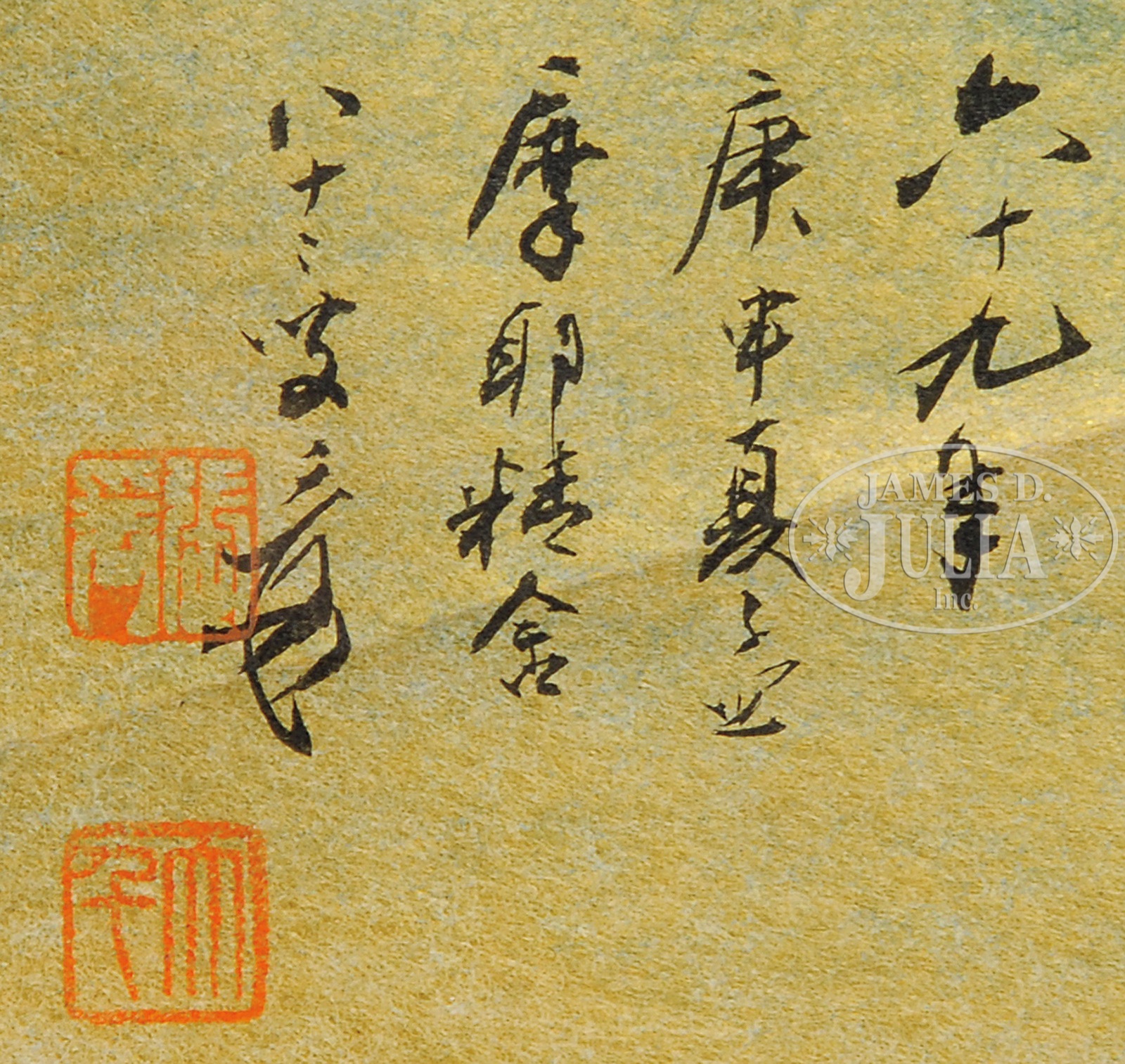 ATTRIBUTED TO ZHANG DAQIAN (Chinese, 1899-1983) CONTEMPLATING UPON SUMMER MOUNTAINS.Contemplating upon Summer Mountains Ink and colors on paper, mounted on board, dated gengshen, sixty-ninth year (of the Republic of China, 1980) Inscribed and signed, with two seals of the artist “Zhang Yuan,” “Daqian” Inscription reads,“the sixty-ninth year, gengshen, midsummer, Moye Jingshe, eighty-two year Old Man Yuan.” Housed in a modern gilt wood frame with linen matte and inner gold liner. “Contemplating upon Summer Mountains” was done in the summer of 1980, the sixty-ninth year of the Republic of China. It represented Zhang Daqian’s mature style of splashed-ink-and-color technique. In Zhang’s later years, due to his ailing eyesight and the limitations it imposed, the artist developed an abstract style reminiscent of the blue and green landscape of the Tang dynasty (618-906). However, Zhang did not totally abandon the gongbi (fine pen) style that dominated his early years. Rather, as this work demonstrated, a lucid structure still can be seen in the swirls of colors and pools of suffused textured ink, interspersed with fine details of pines, rocks, cottages, and sailboats. The velvety blue in the center and the turquoise green in the back almost had a tactile feel to it. The bold application of blue elucidating the basic pictorial form of the foreground mountain was on the same abstract level as an earlier work, “Approach of a Mountain Storm” from 1967, now in the collection of Chang Sing S. and Kuala Lumpur. Moye Jingshe, mentioned in the inscription, was Zhang Daqian’s residence in Taiwan from 1978 until his death in 1983. Zhang moved from California back to Taiwan in 1976. And in 1977, he bought some lands in Waishuangxi, close to the National Palace Museum. The residence was named Moye Jingshe (translated as “Abode of Illusion”). Moye is the Buddhist word for illusion and Jingshe a meditation hut. The painting could be a view the artist saw or imaged from his studio on a midsummer day. It also reminded us of Zhang’s final large work, “Panorama of Mount Lu,” painted between July 1981 to February 1983, now in the Collection of the Dafeng Tang, Taipei. Zhang never visited nor saw Mount Lu and thus the subject matter imbued him with maximum freedom and imagination. Even though the Zhang Daqian did not start working on the long scroll of Mount Lu (commissioned by Li Haitian) until late 1981, the preparation work actually started in 1980. It is possible that “Contemplating upon Summer Mountains” was one of the many variations of smaller sketches Zhang did before taking on the larger challenge. SIZE: 20-1/2″ x 39-1/2″. PROVENANCE: Property of a North American Collection. CONDITION: A paper crease in upper left corner, edges of the paper glued to a wood board, otherwise very good. 49160-1 (3,000-5,000) – Lot 4295