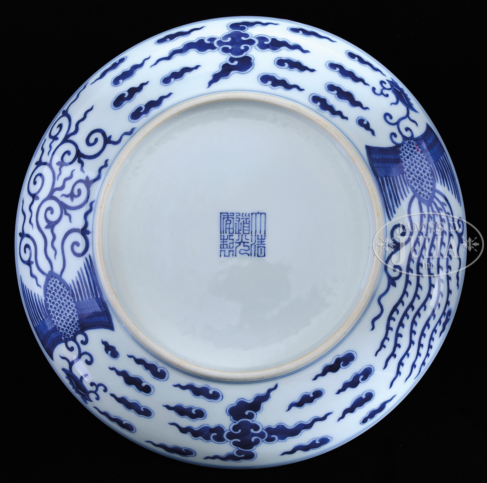 PORCELAIN SAUCER DISH.Early 20th century, China. Underglaze blue decoration of stylized phoenixes and clouds. Tao Kuang mark on base. SIZE: 10-3/4″ dia. CONDITION: Very good. 9-91336 (400-600) – Lot 4298
