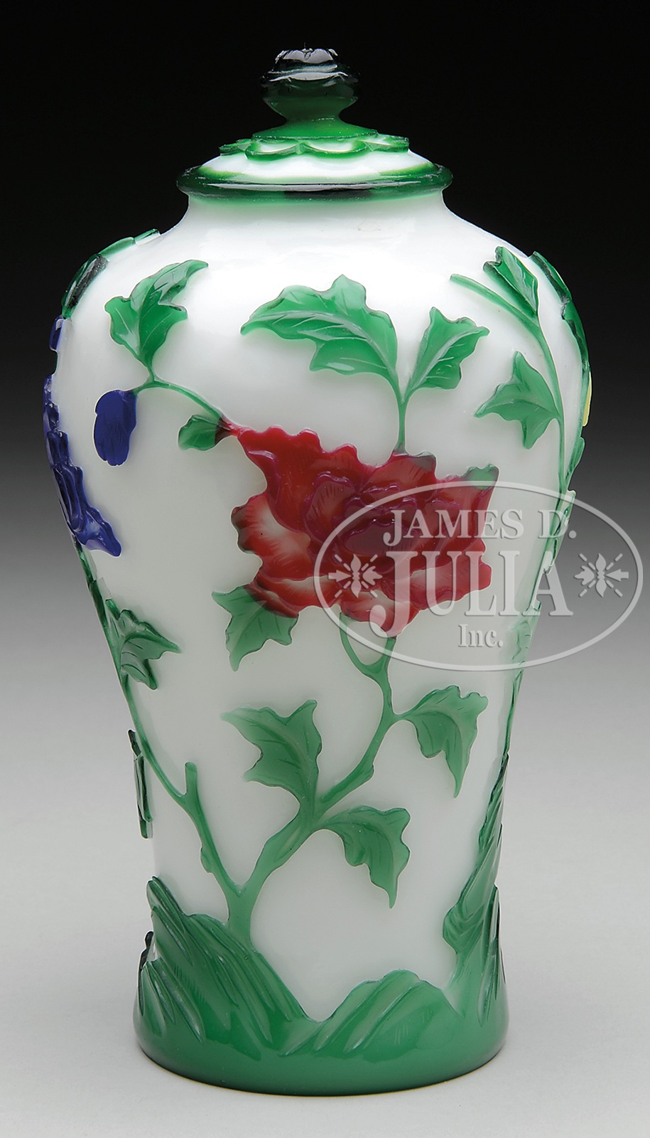 SIX COLOR WHITE PEKING GLASS LIDDED VASE.19th Century. having well carved green plants growing from rockwork. Green plant features red, yellow, pink & blue flowers all beautifully carved. SIZE: 8″ h. CONDITION: Very good. 44568-15 (4,000-6,000) – Lot 4301