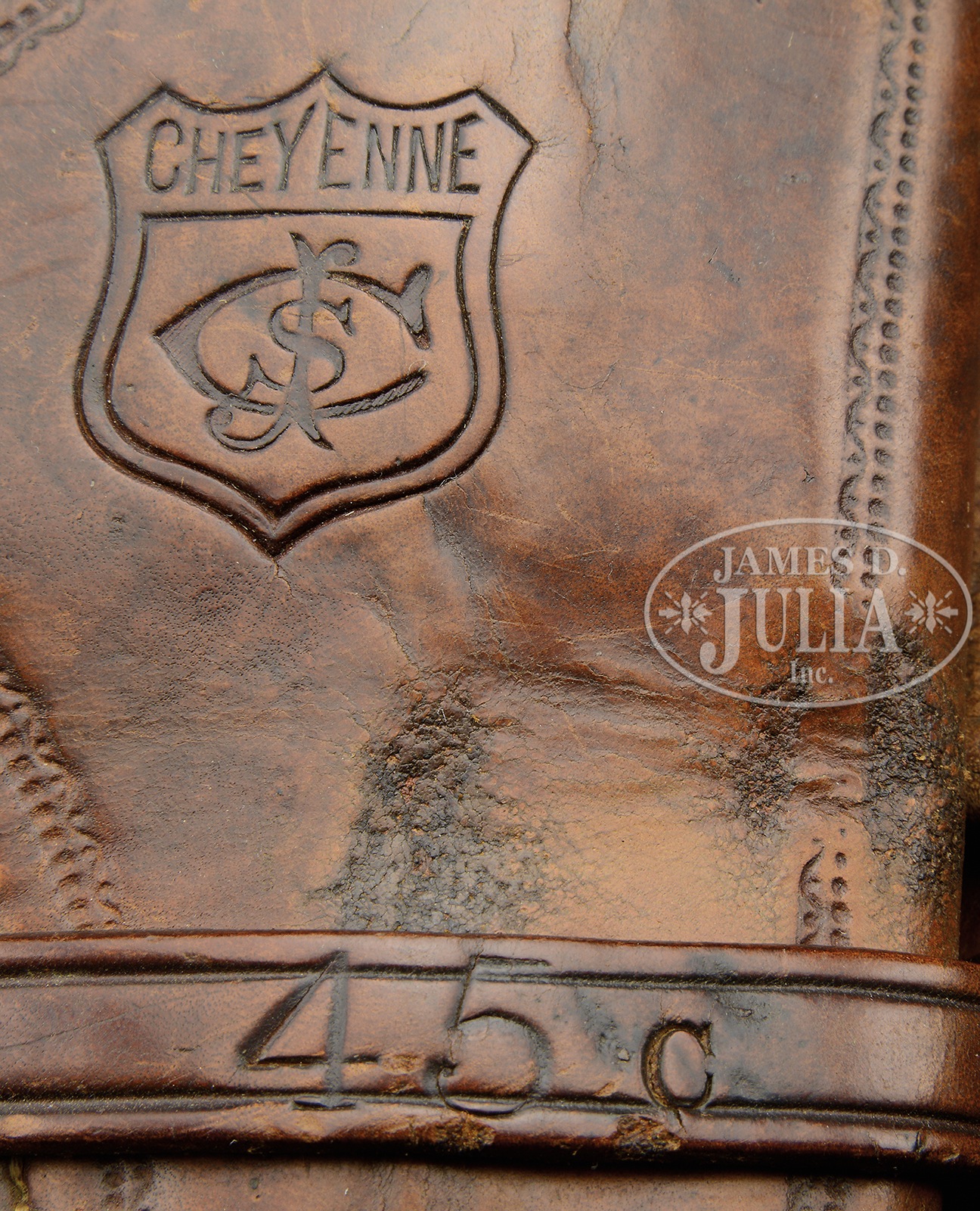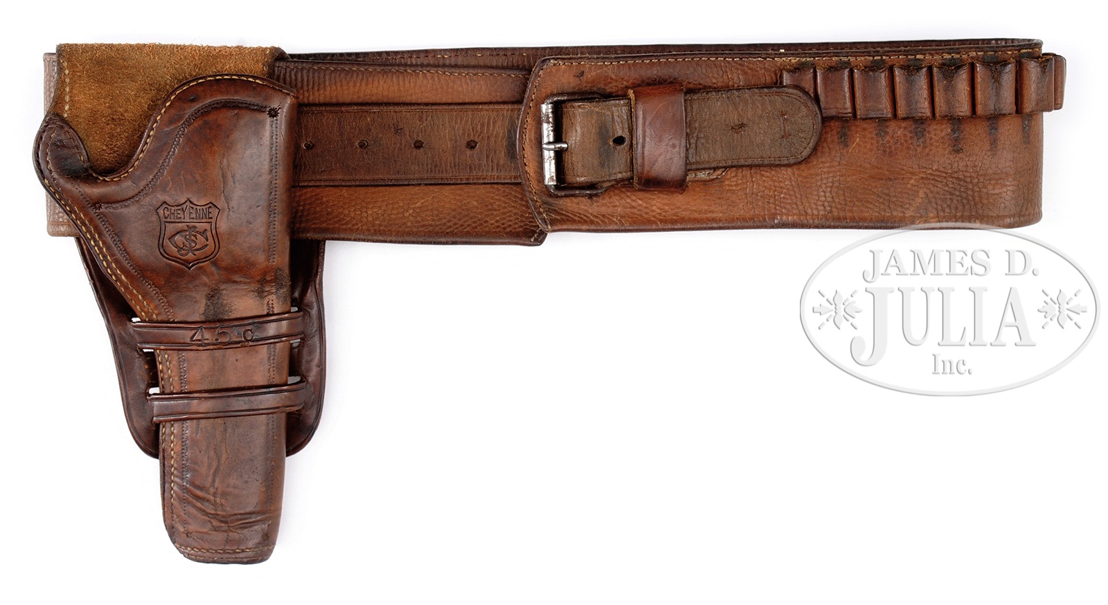 RARE J S COLLINS, CHEYENNE, WYOMING SINGLE ACTION HOLSTER AND MONEY BELT.This late 19th Century single loop money belt and double loop holster for 4-3/4″ Colt Single Action Army is a most desirable and scarce set of Western cowboy leather, especially in such fine condition. Belt tongue is marked in oval cartouche “J.S.COLLINS & CO / CHEYENNE, WYO. ” The holster is marked with the well known J.S. Collins logo in shield. Top loop of holster marked “45 C” of course for 45 Cal. PROVENANCE: Ex-Jay Lyndes Collection; Ex-Bruce Bartlett. CONDITION: Very good overall. Belt has some new stitched reinforcement unaffecting esthetics. Honest wear and staining where cartridges were stored and pistol rested in holster. Some cracking and crazing to holster body as can be seen in photos. 50412-86 JS (5,000-7,000) – Lot 4301