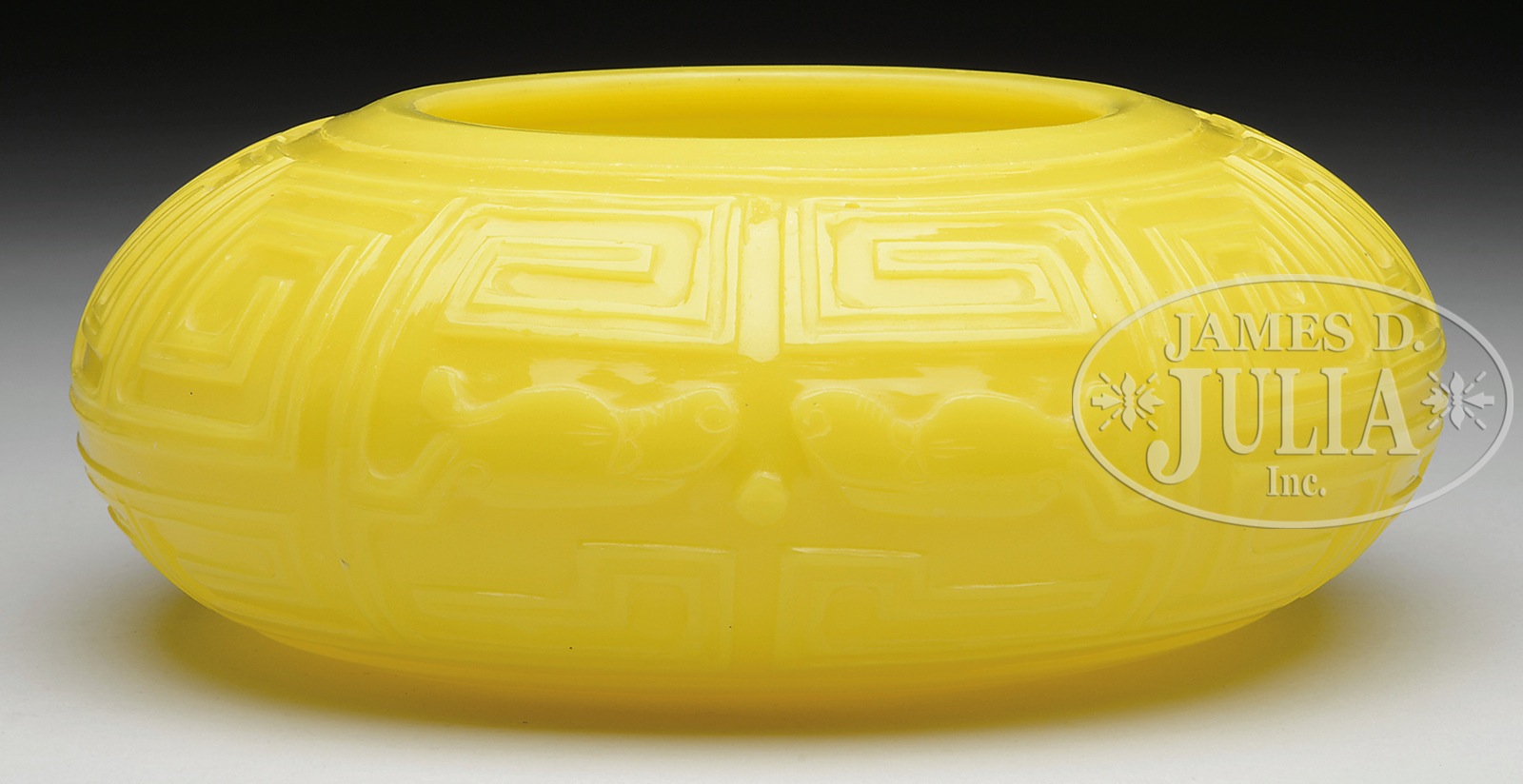 Please note: The correct size is: Approx. 8-1/4” w x 2-3/4” h x 4” open mouth EGG YOLK YELLOW TRANSLUCENT PEKING GLASS LOW BOWL.Mid 19th Century. Bowl with wide mouth. Hand carved around entire body with stylized dragons facing a pearl. Having low rim foot on base. SIZE: Approximately 13″ h. CONDITION: Very good. 44568-13 (3,000-5,000) – Lot 4302