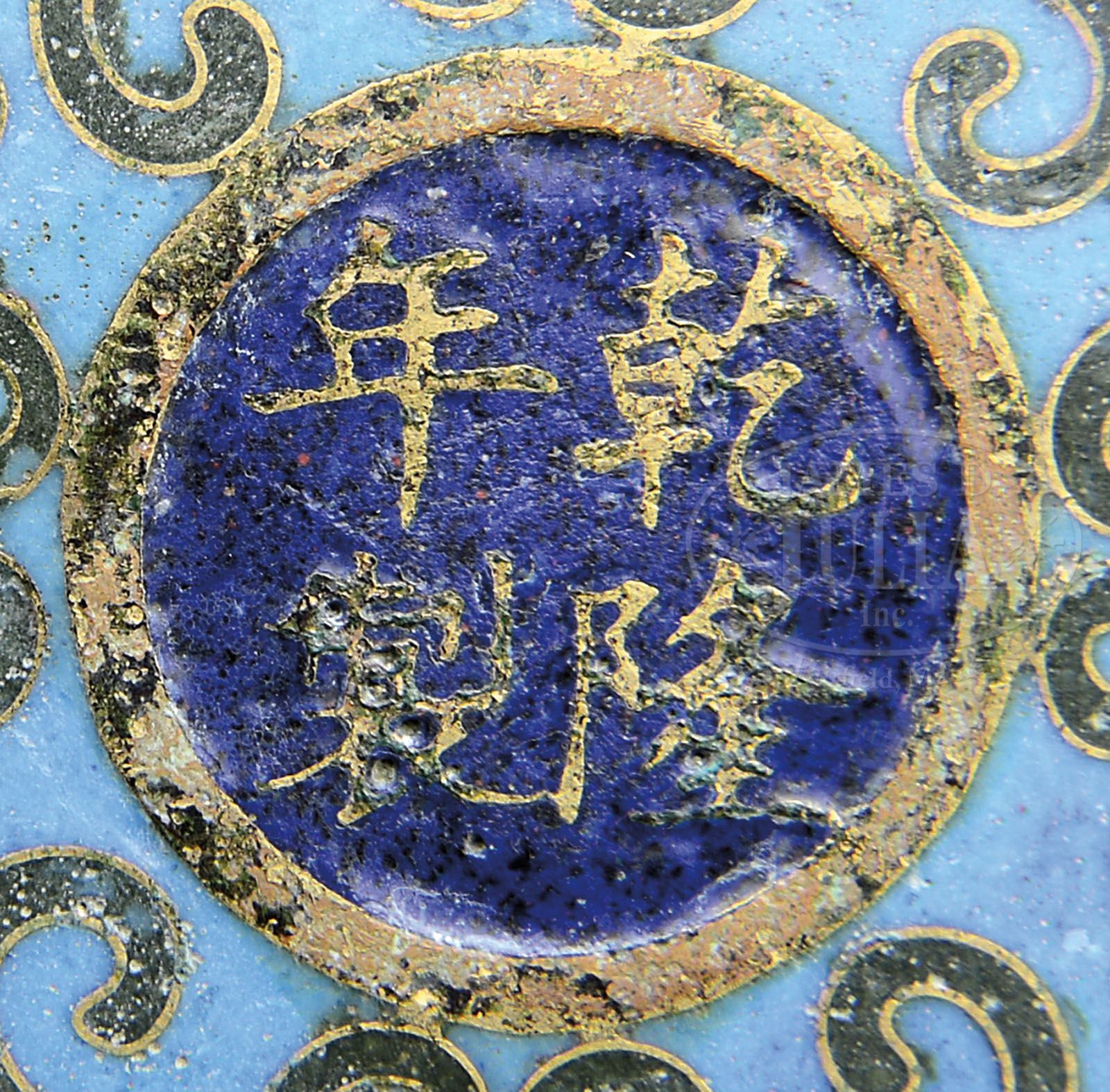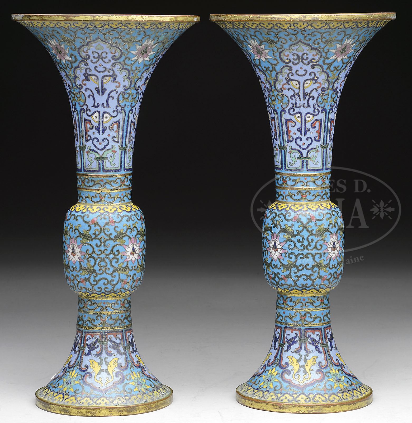 PAIR OF CLOISONNE VASES. 20th century, China. Shaped as archaic ritual bronze beakers Ku, decoration of taotie masks in formalized lotus scrolling on lavender and turquoise grounds, ju-i borders of yellow & blue enamel. Ch’ien Lung mark on the base. Each is accompanied by a box. SIZE: 11” t x 5-1/4” dia. PROVENANCE: The Estate of John Gerhardt Family Trust. CONDITION: Considerable pitting and wear to gilt. 9-25041 (1,500-1,800)