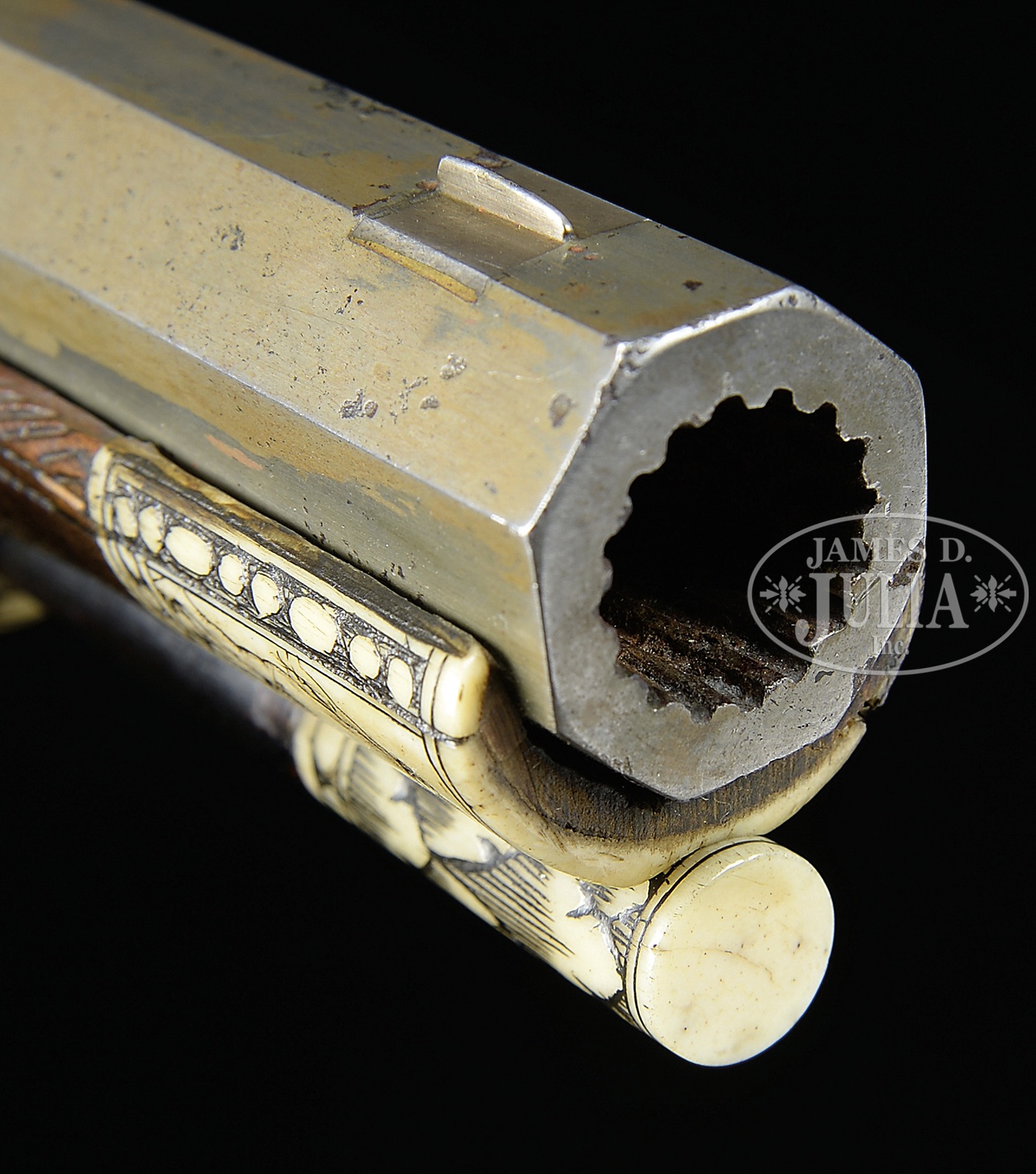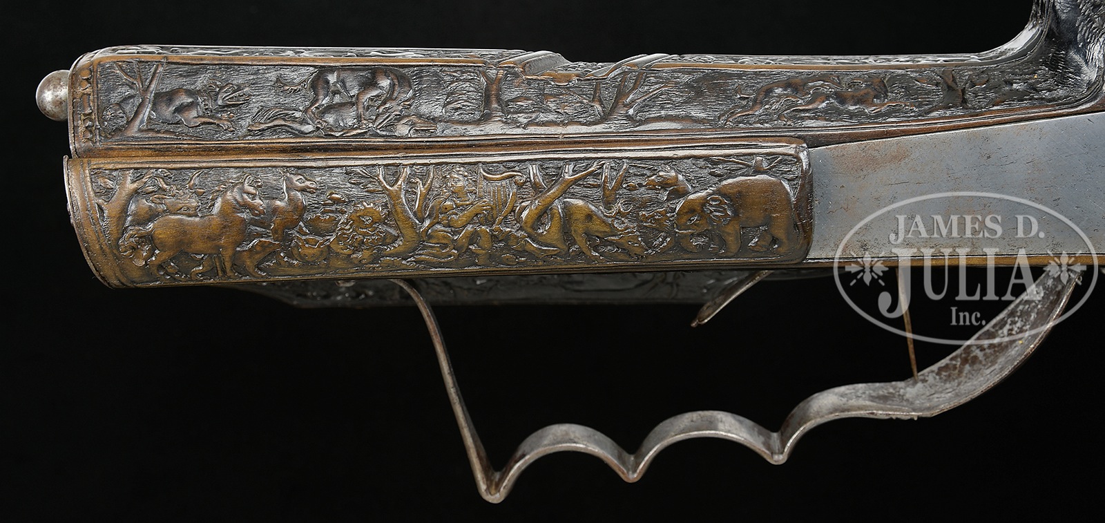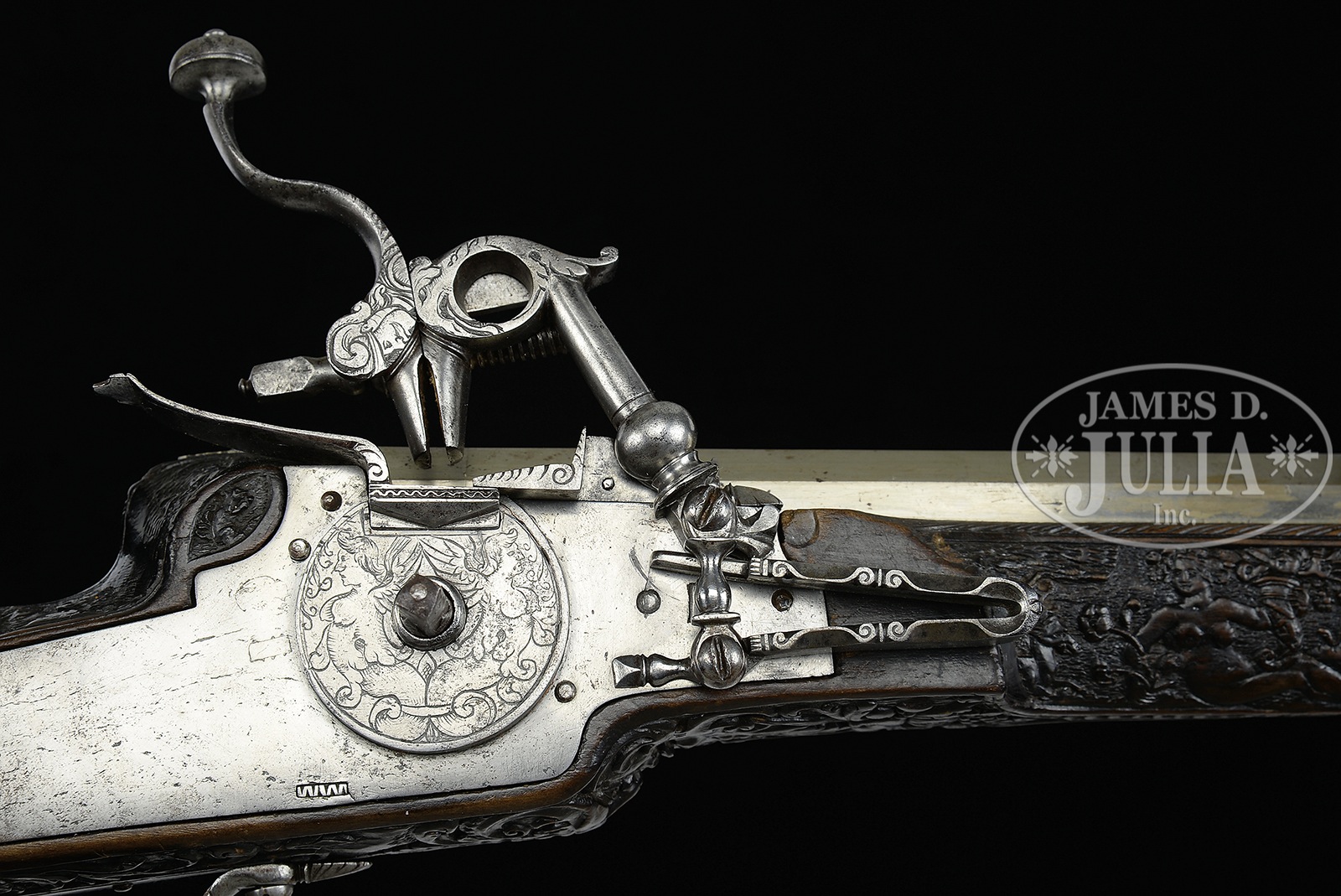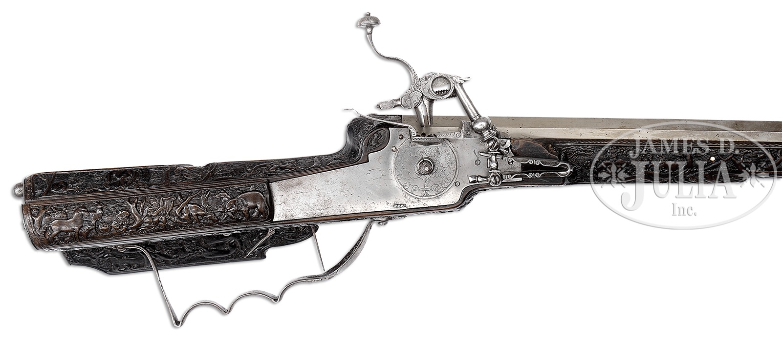 VERY RARE AND MAGNIFICENT GERMAN WHEELOCK RIFLE WITH FULLY CARVED STOCK BY GEORG MAUCHER THE ELDER OR HIS SON GEORG THE YOUNGER OF SCHWABISCH-GMUND CIRCA 1650, EX-COLLECTION WILLIAM SIMON, US SECRETARY OF TREASURY.SN NSN. This fabulously carved wheelock is convincingly attributed as an autograph work to one of the two Mauchers by Dr. Stuart W. Phyrr, Emeritus Curator of Arms and Armor at the Metropolitan Museum of Art. Dr. Phyrr states in a letter dated August 1, 2000: “Although the rifle is not signed, I think it is safe to assign the carving of the stock to Georg Maucher or his son Georg.” The heavy rifled octagonal barrel is relatively plain. The flat lock has a wheel cover engraved with two female figures and the hammer is engraved with a warrior’s face surmounting a serpent. A pierced lever actuated the hair trigger. The iron triggerguard is decorated with light but well executed engraving. Maucher rifles all have relatively plain metalwork so as not to compete with the artistic glories of the carved wooden stocks and polished bone panels. The stock on the rifle is superbly carved throughout its length and the coverage is so extensive that it takes up more than 95% of its surface. The fore-end is carved with scenes of the hunt and animals engaged in chasing other animals. The area forward of the lock is carved with a nude female figure, likely Diana, Goddess of the Hunt. A monster head adorns the ramrod channel and a large man’s head is carved below the lock. The underside of the stock is carved with foliage ending in a large hare. The sideplate area depicts an extensive scene in which a hunter in 17th century costume is piercing a stag beset by three hounds. The patchbox depicts a sylvan scene in which a woman holds a lyre playing to a boar, a horse, a stag, a unicorn, an elephant, a lion, a rabbit, a dog, a doe, and a bull. The upper edge of the stock features foliage and the hunt while the cheekpiece is carved with a woodland scene in which a crowned king sits in a chariot drawn by two horses. He holds a globe (orb) in his left hand and a scepter in his right, the classic posture of a European monarch. The inside edge of the cheekpiece is carved with a boar being attacked by three hounds while a hunted holds a boarspear. This rifle is likely the forth in a series of Maucher masterpieces made for European Royalty with allegorical representations of the Four Continents: Africa in Vienna, America in Dresden, and Asia in the Metropolitan Museum. The crowned monarch in this rifle represents Europe (Europa). Being the previously undiscovered rifle in such an important series, which was obviously a royal commission, makes this Maucher masterpiece more than a supreme work of art by of one of history’s finest woodcarvers. This rifle is a true treasure firearm and represents as does the Maucher flintlock pistol, a rare if not unique opportunity for the collector or institution to acquire one of the finest examples of the gunmaker’s art. PROVENANCE: William Simon Collection; Eric Vaule Collection; Lot 568A James D. Julia Auctions, October 10, 2000. CONDITION: The rifle is original and in fine condition throughout. The barrel and lock have been cleaned to natural steel color in the European tradition leaving the slightest traces of fine pitting. There are a few extremely minor imperfections in the carving and slight chipping in the ramrod channel. A small wood sliver on the left side of the barrel near the forend is a replacement. The polished bone forend tip itself has its 1/2″ top section replaced area on the left side of of less patinaed bone carved to match. There is a professionally restored break between on bottom of gun running about 6″ on flat panel in same plane of lockspring tapering on either side terminating where ramrod enters stock; this professional conservation occurred about 20 years ago when gun fell from display when in Secretary Simon’s Collection. Regardless, overall the Maucher Europa rifle is in a remarkable state of preservation. 49867-1 (50,000-70,000) – Lot 4311 Click here to view provenance