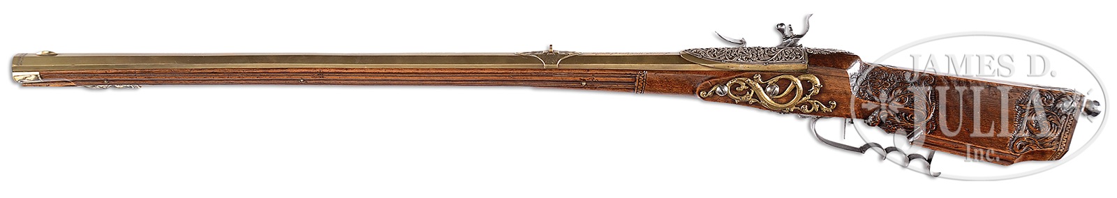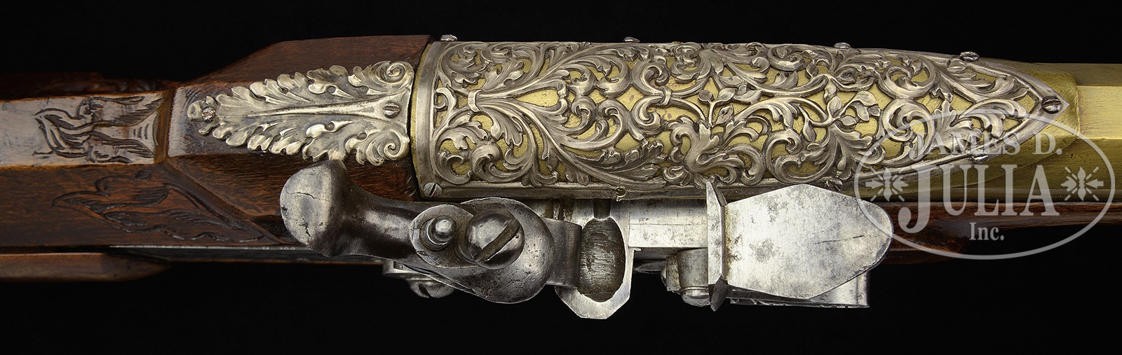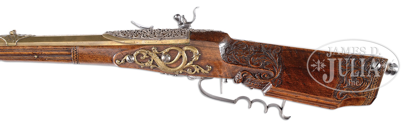 EXTREMELY RARE, ELABORATE AND EXTREMELY FINE CIRCA 1700 BAVARIAN BARREL RESERVOIR AIR GUN BY ANDREAS WETSCHGIN.SN NSN. Cal. 8mm. 49-1/2″ overall, 35-7/8″ oct brass bbl, slightly swamped with fixed rear and front blade sight. Rear sight is mounted on 4-sided, 3″ engraved pedestal and is signed “ANDREAS WETSCHGIN AUGUSTAE”. Andreas Wetschgin, according to Stockel, worked in Augsburg, 1690-1716. Lock and hammer are finely engraved in floral scrolls. Figured full walnut stock has relief and incised designs toward butt and full flutes carved on forestock. Polished bone nosecap and front ramrod thimble are foliate engraved with rear relief zig-zag carved band, which is also carved in stock and interface of fluted carving in forestock, and also en suite with same border framing buttcap and sliding wood patchbox cover. Large 6″ brass sideplate is pierced and engraved with foliage terminating in two dragon heads. Dbl set triggers with moulded steel trigger guard shaped for the fingers, steel trigger plate with pierced foliate finials. Horn buttcap, pierced foliate and arabesque 5-1/2″ x 2″ silver applique to reservoir breech and 2″ foliate silver tang extension. A less ornate example signed only with “AW” and “orb” is shown as Fig. 38 in Arne Hoff’s text Airguns and Other Pneumatic Arms, London, 1972. This is a truly exemplary piece of art that amazingly has survived in such extraordinary condition after 300 years. CONDITION: Gun appears fine overall. Mechanically gun is functional including pump mechanism from butt of stock, though seal no longer holds air well. Bore is clean and smooth. Surfaces exhibit old cleaning with light varnish surface overall. Gun appears orig and complete, missing 1 screw to silver applique over breech. 50676-1 JS (12,500-17,500) – Lot 4313 Click here to view provenance