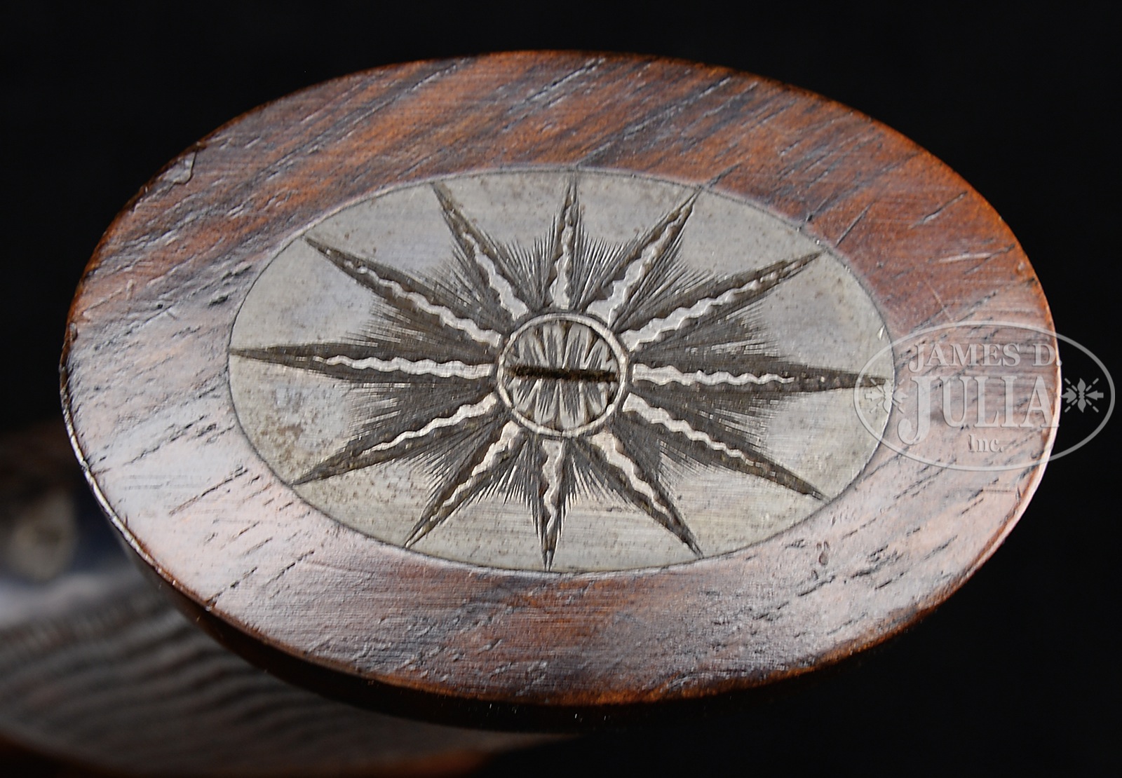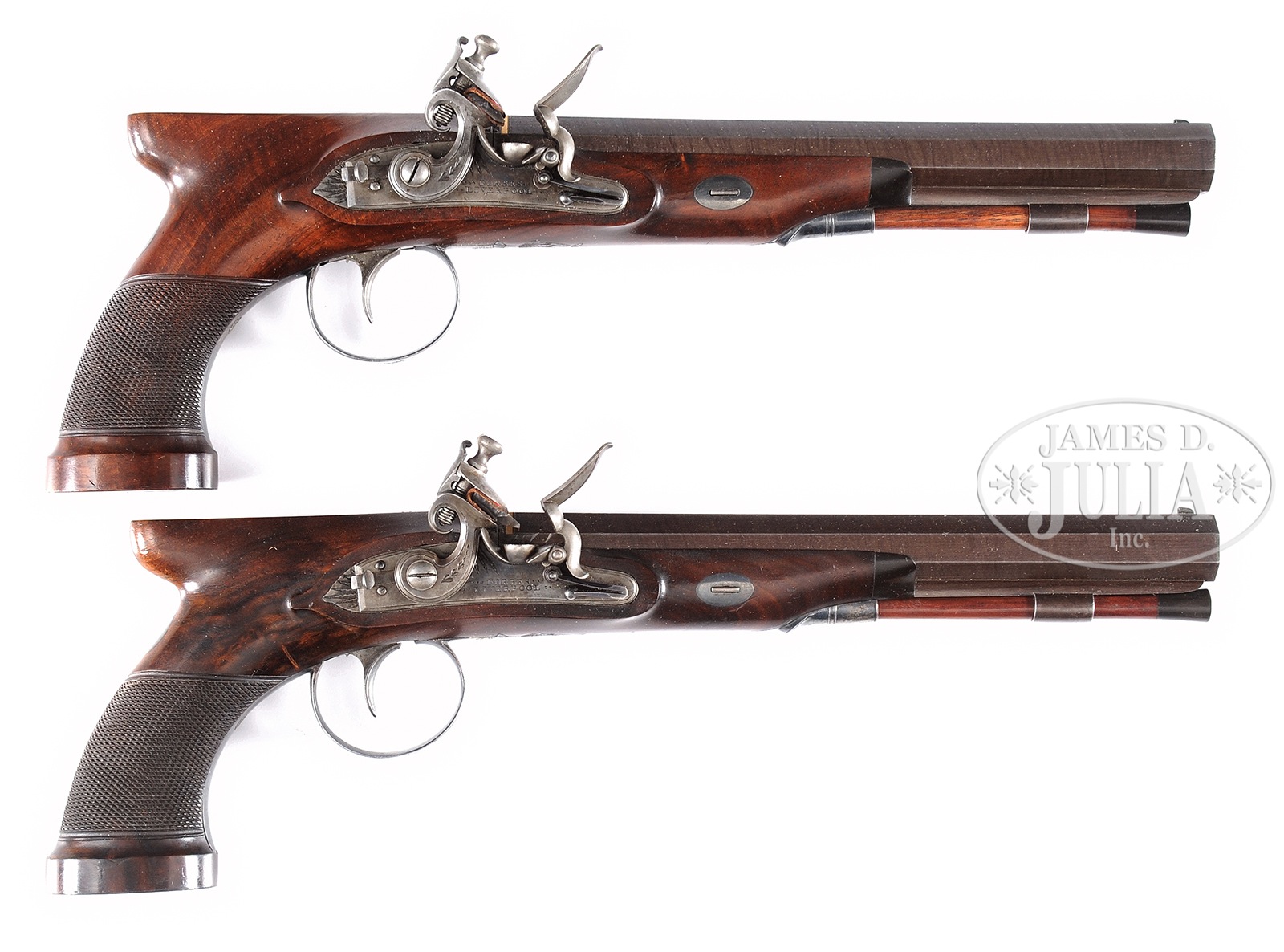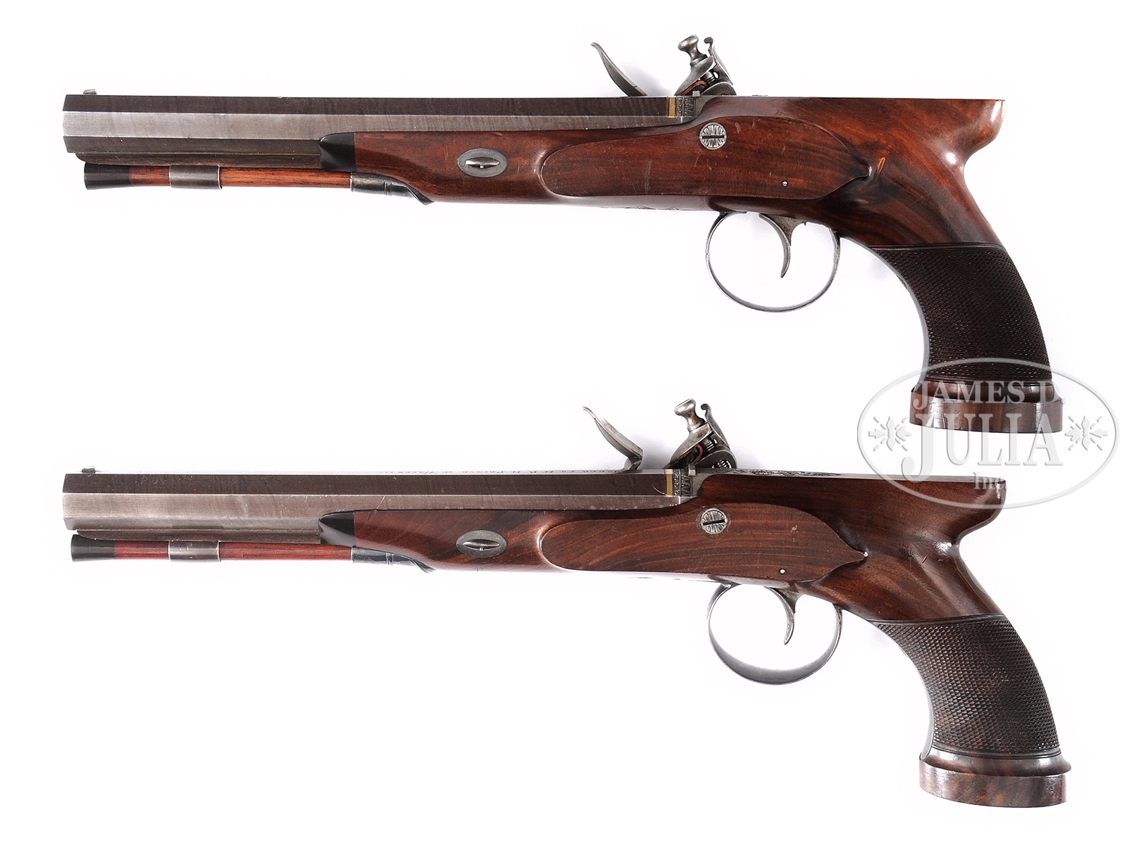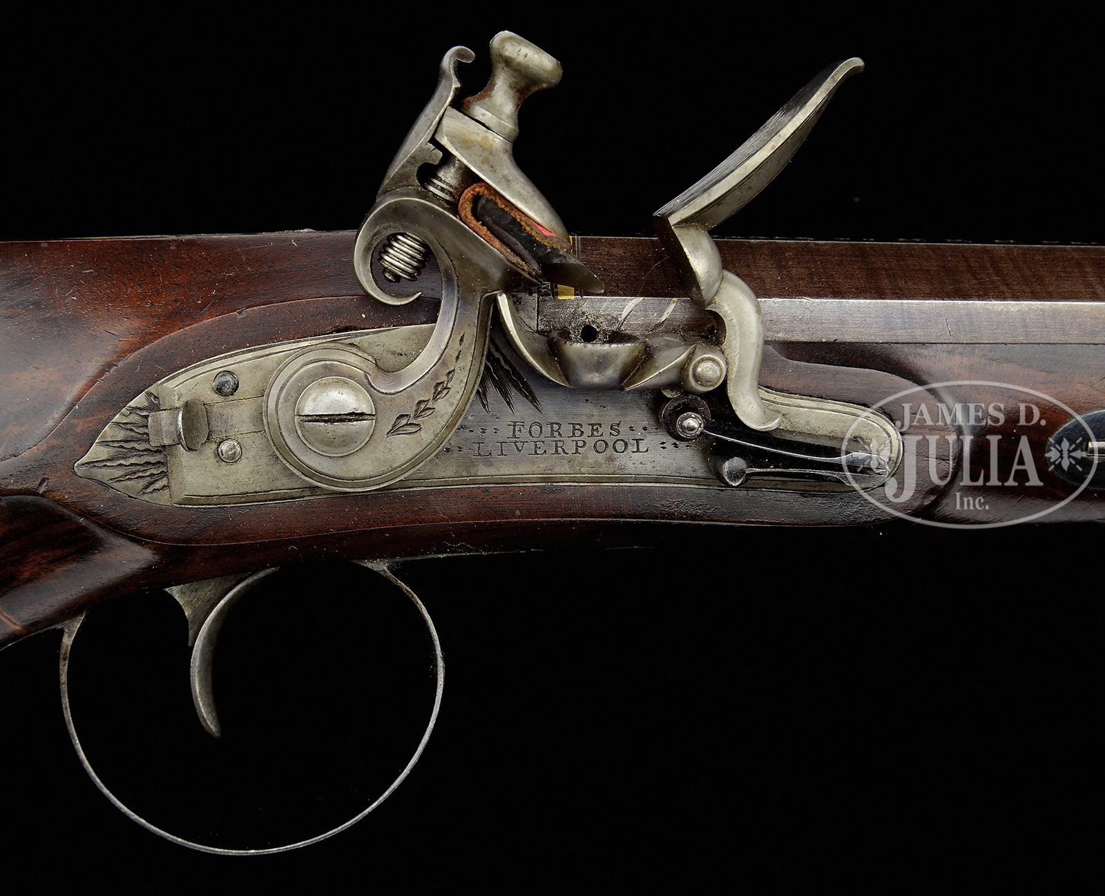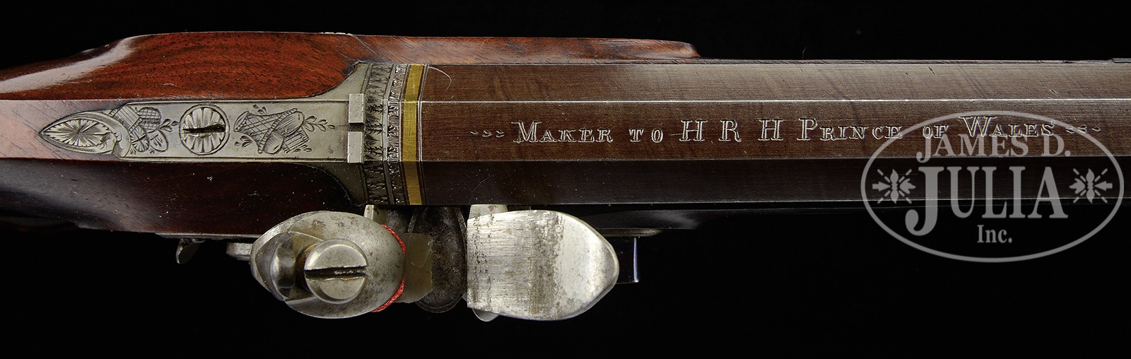 EXCEPTIONALLY FINE ORIGINAL CONDITION SAW HANDLED DUELING OR TARGET PISTOLS BY JOHN FORBES OF LIVERPOOL WITH CASE AND ACCESSORIES.SN NSN. Cal. 57. (.565 smooth bore) These high condition pistols have 9″ twist octagonal bbls with gold bands at breech ends engraved “Maker to HRH Prince of Wales” on top flats, and have plain unlined touch holes. Breech irons with integral U-notch rear sights are engraved with baskets of fruit. Locks with engraved beveled edges and rebated flame engraved tails, have semi-waterproof pans, bridled roller frizzens with roller on feather springs, and back sliding safeties which engage French cocks at half cock. Plates are engraved “FORBES” “LIVERPOOL” at centers under pans. Nicely laid out root European walnut saw handled stocks with flared checkered grips having inlet flat starburst caps, are iron mounted. Trigger guards with integral stylized pineapple finials have armorial engraving on bows. Bbls have under ribs fitted with single plain pipes holding walnut ramrods with horn tips, one rod with worm. Rods mount through filed steel thimbles. Half stocks are tipped with horn and mount to bbls with captive side nails through oval silver escutcheons. What appears to be orig mahogany case has key lock closure, and is lined in what appears to be orig green baize. Accessories include copper bodied powder/ ball flask, nutcracker type ball mold marked “26”, spare cleaning/ ramrod with large steel head and steel tail accepting cleaning loop, rosewood cleaning/ loading rod, and a rather new turnscrew. One small covered compartment holds a number of lead balls. The other compartment holds a small pewter oil bottle. Covers are mahogany with bone knobs. CONDITION: Excellent, original. Wood and metal retain nearly all their orig finishes with a number of light marks, knocks and scratches. Bores are excellent. Locks and frizzens are crisp. John Forbes worked in Liverpool between 1806 and 1810 at 50 Lord Street. 50657-2 MGM258 (8,000-12,000) – Lot 4315 Click here to view provenance