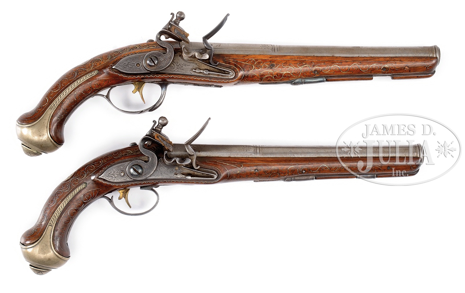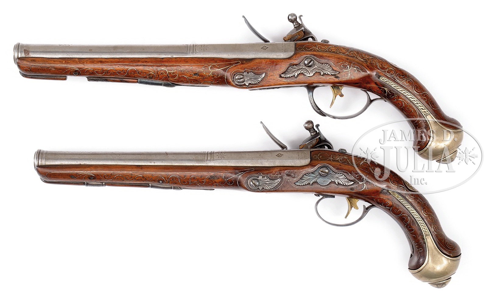 PAIR OF NORTHEASTERN EUROPEAN FLINTLOCK HOLSTER PISTOLS MARKED NORRT NORRN.SN NSN. Cal. 50 bore. (.575 Smooth bore) 9-1/4″ Bbls have octagonal section transitioning through band to round with flared cannon muzzles. Breech section of one is engraved “NORRT NORRN” and the other “NORRT NORD”. (Heer lists a Norrt working in Estonia 1790 – 1800.) Breeches of both are stamped with foliate marks in lozenges surrounding two poincon, one round stamped “NON”, the other shaped is marked “AND” (?) “SAT”. Locks with flat plates, serpentine cocks, inset pans, bridled friction frizzens, are engraved with open scrolls and foliate highlights. Stocks, appear to be of elm, extend to muzzles and have knob grips having German silver caps with long side straps. Other furniture is of iron and is line border and foliate engraved. “Ramrods” are false and carved in. Stocks are further decorated with near full coverage chinoiserie wire inlay, and cartouches on tops of grips are engraved with snow flakes. CONDITION: Good. Iron parts cleaned to pewter gray, and are smooth. Wood has old refinish. Locks are operable. Ramrod pipe missing from one gun. Butt cap of one gun does not fit well. 50458-3 MGM305 (5,000-8,000) – Lot 4318