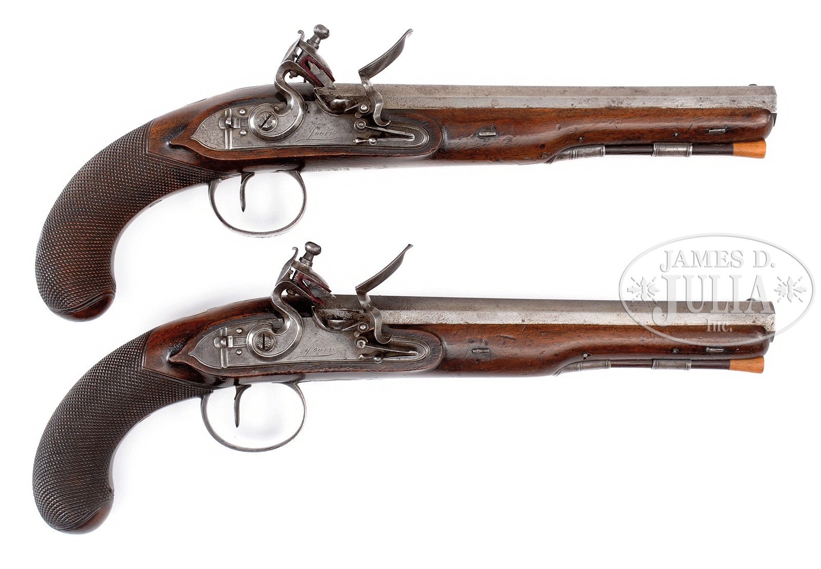 SN NSN. Cal. 65. (.660 diameter smooth bore) 9″ Tapered octagon bbls are engraved “London” on top flats, and are stamped with Birmingham proofs. Bbls with unlined touch holes have plain breech plugs, and scroll engraved tangs with integral U-notch sights. Lockplates have slight bevels with rebated tails and short teats, as well as back sliding safeties, semi-waterproof pans, and bridled roller frizzens with rollers on feather springs having bulbous finials. Serpentine cocks have beveled sides. Locks and cocks are line border engraved, and have “Jover” under pans. European walnut stocks extend to 1/8″ of muzzles, and have checkered bag grips. Furniture is of iron. Trigger guards have pineapple finials, with shields on bows. Tops of grips have family crests engraved on inlet silver shields. Boxwood tipped rosewood ramrods mount through beaded pipes and nicely filed thimbles. Stocks attach to bbls with two captive side nails without escutcheons. CONDITION: Good. Bbls are cleaned to bright pewter over considerable pinprick pitting. Locks cleaned to pewter gray, are smooth. Trigger guards have traces of orig blue. Stocks are good, with no noted repairs, and retain most of their orig finish, perhaps with some oil added as maintenance over the years. Bores are good, lightly pitted. Locks and frizzens are crisp. William Jover worked at 65 New Bond Street London between 1797 and 1807. 50828-2 MGM260 (4,000-5,500) – Lot 4320
