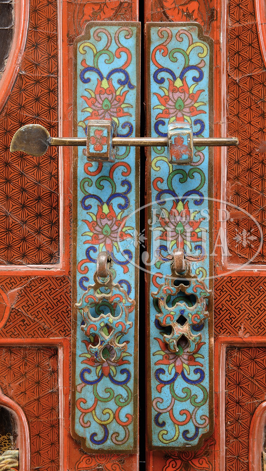 RED LACQUER “HUNDRED BOYS” CABINET.18th/19th century, China. Front panels decorated with black lacquer and gilt painted scenes containing tinted bone carved young boys. Mounts and hinges of cloisonne enamel, all on a red lacquered ground containing dragons and lotus blooms, interior with one shelf and one hidden compartment, all decorated in black lacquer with gilt painted florals. SIZE: 61-1/2″ h. CONDITION: Lacquer with profuse cracking. Minor losses to inlays. Some loose joints. Overall wear typical of age. Otherwise good. 1010-4 (1,500-2,500) – Lot 4326