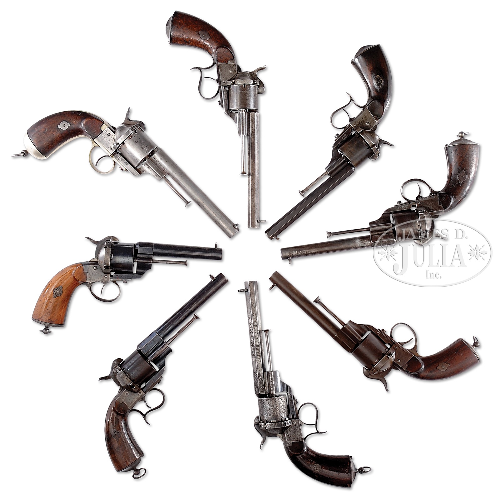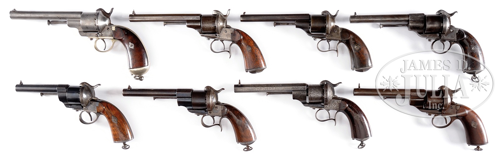 SN 334/1071/1822/7587/66559/66673/111070. This group of 8 revolvers illustrates the evolution in thought and manufacturing process. When Eugene Lefaucheux inherited his father Casimir’s business, he also inherited his inventive genius and keen business sense. Introduced in the spring of 1854, this revolver was the most advanced handgun in the world. Heavy frame, large cal., it was much easier to load and fire, requiring far less time and training to become proficient in its use. Even better, it used the revolutionary new, self-contained internally primed waterproof metallic cartridge. This collection of 8 revolvers starts with SN 334 which is a very early example and likely a prototype by Eugene Lefaucheux to hopefully interest the military. It has several features that are not found on later revolvers, SN and logo are on the opposite side of the frame, full rnd bbl, the grip style is similar to flintlock and percussion pistols. Even the parts numbering system is of the production style of his father who died in 1852 before Eugene started perfecting his system. SN 1071 has features identical to the first patent application drawing and this exact gun is pictured on pg 40 of Systeme Lefaucheux, SN 1822 has all the early features of the patent drawing, however in special order 9mm and is the only early feature revolver studied thus far in that cal. The retailer “LEPAGE” is marked on bbl. SN 7587 has the mixed features of the rnd “navy” style trigger guard and the fluted “cavalry” style buttcap. Lefaucheux was always open to the idea of special orders for a few extra francs. SN 66559 exhibits two special order features, full oct bbl and 9mm cal., extremely rare in this cal. This particular gun was liberated by an American WWII GI who tastefully has engraved his name, unit and travels on the bbl. This engraved example is a very interest piece with a secondary history. SN 66673, short bbl and rnd trigger guard, this style was favored by French Foreign Legion officers, this exact gun pictured on pg 82 Systeme LeFaucheux . SN 111,070 among the last revolvers made with rnd trigger guard and oval buttcap of the “navy” style models. This exact revolver pictured on pg 43. The last gun in our grouping has no SN, though all major parts have matching assembly numbers including the grips. This gun was probably “lunch boxed” out after the final phase of the assembly. This grouping is accompanied by a signed copy of Chris Curtis’ book where several of these guns are pictured. PROVENANCE: Ex-Chris Curtis Collection. CONDITION: Guns overall are very good to excellent with SN 66559 the best retaining most of its orig finish and extremely fine overall. SN 66673 is the only factory engraved gun in this grouping, has strong traces of finish, is crisp and has the most unusual embellishment by an American GI as can be seen in photos. all guns appear orig, complete and functioning, though SN 344 does not index, it does cock. 50269-1 JS (15,000-20,000) – Lot 4326