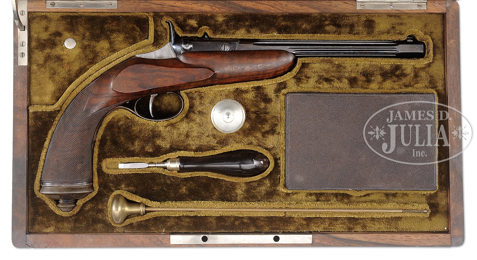 FLOBERT PARLOR PISTOL BY N. GUYOT WITH CASE AND ACCESSORIES.SN NSN. Cal. 22 BB CAP. 8-1/2″ Fluted octagon bbl is engraved “Fni PAR N. GUYOT a PARIS” “12 RUE DE PONTHIEU” on breech section which has dovetailed through U-notch rear sight. Lifting of breech section actuates extractor, and fall of hammer locks breech section in place. Nicely figured European walnut stock has checkered extreme pistol grip with case hardened steel cap and finial. Trigger plate has nicely filed finial. Case hardened trigger guard has raised two color gold inlaid monogram “AR” matching inlet silver monogram on top of walnut case. Case is lined in gold velvet with Guyot name and address printed in lid. Case is french fitted for pistol and accessories including brass cleaning rod, horn handled turnscrew, round pewter oil bottle, and pebble morocco leather cartridge box. A covered compartment holds cleaning brushes. CONDITION: Excellent. Metal parts retain 80 – 90% of their orig finish, with some flecking and flaking on bbl, silvering of trigger guard, and a few light marks in orig finish of stock. Case exterior retains most of what appears to be its orig finish with a couple of stress cracks and many scratches. Interior cloth is very fine with compressions. Accessories are very fine. 50657-1 MGM257 (3,000-5,000) – Lot 4329