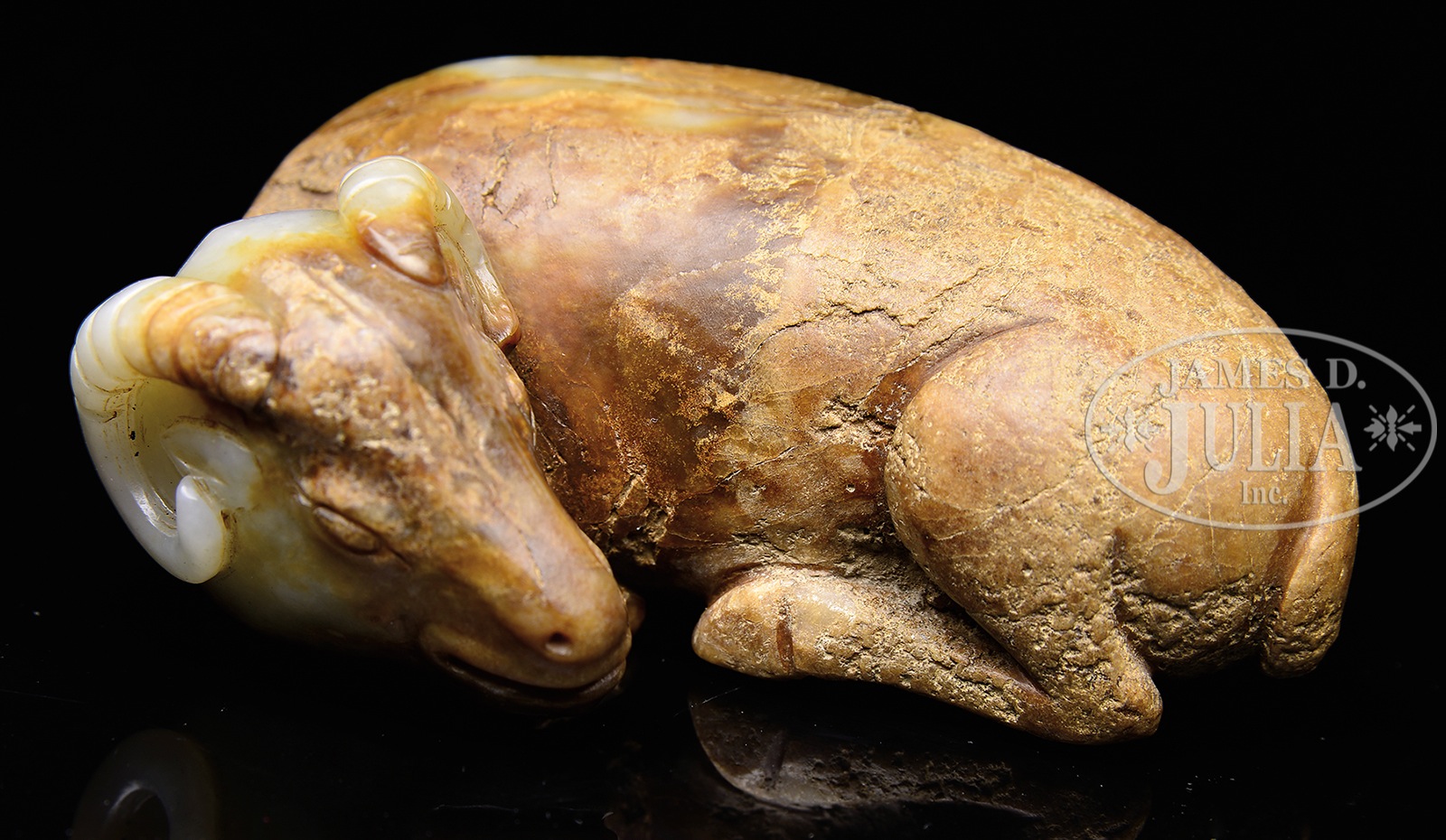 JADE CARVING IN THE FORM OF A RAM.Ming period or earlier, China. Reclining figure of white and calcified jade. SIZE: 3″ l. CONDITION: Very good. 7-74964 (1,000-1,500) – Lot 4335