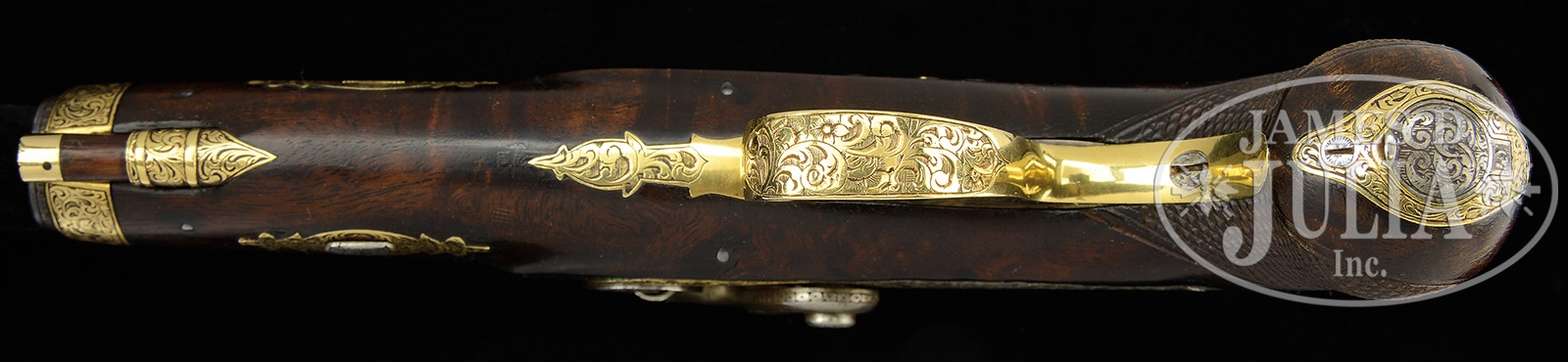 EXTREMELY FINE ELABORATELY ENGRAVED AND GOLD MOUNTED HENRY DERINGER PERCUSSION PISTOL.SN NSN. Cal. 52. This gun measures 7-1/4 overall, 2-7/8″ bbl with 3-9/16″ including breech. Lock and breech are both full firm marked “DERINGER PHILADELa”. This is possibly the most elaborate Henry Deringer pistol noted, with great collection history. There is nothing in Doug Eberhart’s The Deringer in America that approaches the level of engraving or quantity of gold mountings. The few other known gold mounted guns are less elaborate and this is among the few large bore smooth bores known. Engraving covers fully 100% of steel of lock, hammer face, breech, bbl tang, bolster face, key face, trapdoor in butt, hammer screw, tang screw, both lock screws, top flat of bbl and about 1/3 of remainder of bbl. Even the trigger plate which can hardly be seen is also fully engraved. Engraving is also by a much finer hand than encountered on other Deringers. Gold mountings on this gun include trigger guard, both lock escutcheons, key way escutcheons, nosecap, thimble, ramrod tip, front sight, breech bands, butt escutcheon and shield shaped thumbplate with the logo of owner “GD”. Gold mountings on this gun are also profusely engraved with exception of ramrod tip, bbl bands, and front sight. This Philadelphia made Henry Deringer is a true piece of art and there is not a more elaborate example known. PROVENANCE: Ex-Fred Clough Collection; Ex-Doug Eberhart Collection. CONDITION: Very fine overall. Gun appears unfired or very little, with a crisp smooth bore and breech. Traces of muted case color are found on breech, lock, trigger and hammer, but mostly a crisp silver/grey color overall. The bbl retains thin traces of blue finish unlike the typical striped brown finishes seen on standard production pistols. This gun indeed was especially made for an important client whoever the initials “GD” represent. Gold mountings are well fit with crisp arabesque and foliate engraving into deluxe selected walnut stock with beautiful grain and color. The orig ramrod has internal case hardened steel worm screwed to jag. Stock is sound and solid with strong checkering. There are two 1/2″ hairline cracks both on left side; one just rear of key way escutcheon and one in checkering near butt that do not affect the overall aesthetics of this little gem. Mechanically, gun functions well including adjustable set trigger screw. Bore is smooth with scattered areas of light pitting. 50412-46 JS (20,000-40,000) – Lot 4336