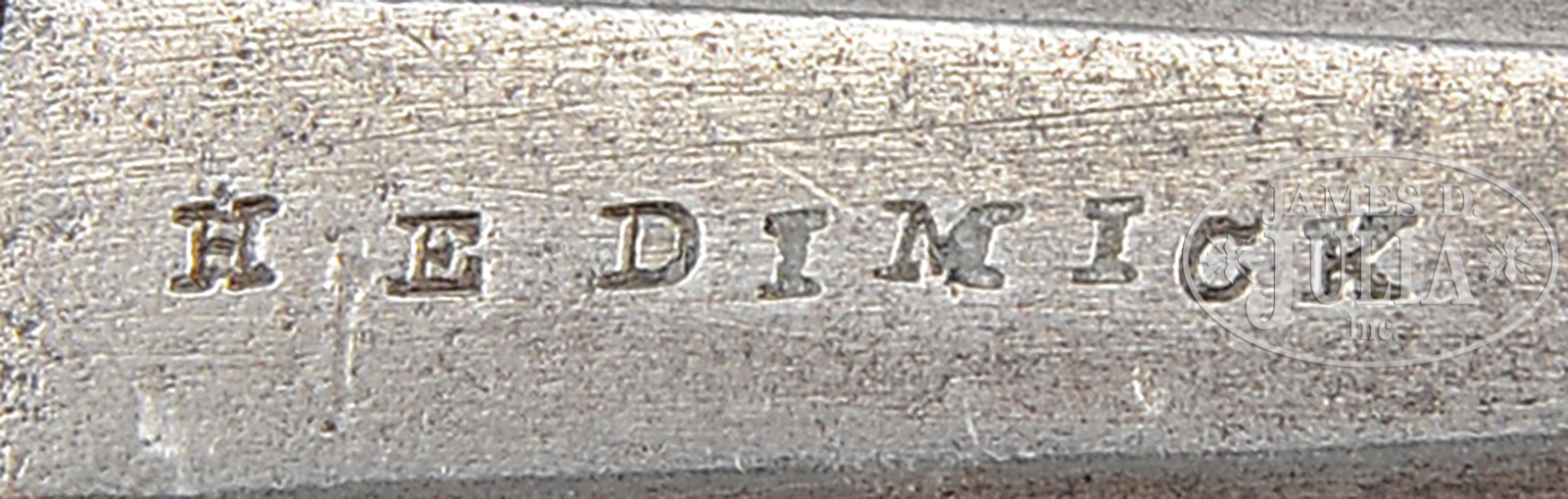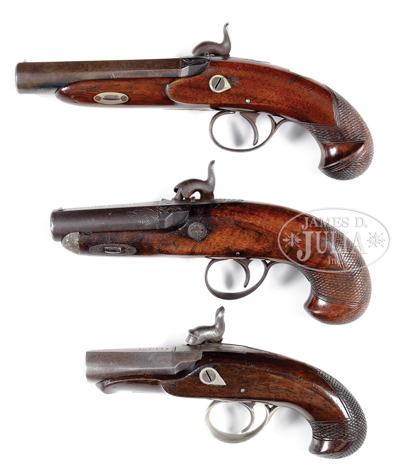 RARE TRIO OF H.E. DIMICK ST LOUIS, MISSOURI DERINGERS.SN NSN. Cal. 44. This is a great selection of three variant Deringers made by Horace E. Dimick of St. Louis, MO. The three guns in this trio have the most typical variant marks seen by this manufacturer who advertised as early as 1849 in St. Louis and kept his store open throughout the Civil War according to Eberhart & Wilson in their text The Deringer in America Vol. 1. The three guns here measure from 5-3/4″ to 7-1/2″ with bbls from 2″ to 3-1/2″. The longest of these guns is marked “H.E. DIMICK” on bbl and lock. The midsize gun is marked “H.E. DIMICK & CO ST LOUIS MO” on bbl, and the same on lock without city. This gun has stamped name “G WIRSING” under lock; quick search of database finds only five Wirsing’s in the entire Union or Confederate army and only one “G”, George Wirsing from Belleville, IL who served in the 43rd Illinois Infantry during the Civil War, enlisting August 1861, being discharged for disability May 15, 1863, the 43rd was a hard fighting unit in Tennessee being in the midst of the actions at Shiloh, April 6 & 7 1862. Smallest of these guns is simply marked “H.E. DIMICK” on bbl flat. The two larger guns are iron mounted and the smallest gun is totally German silver mounted. This is a once in a lifetime opportunity to buy in one lot three fine Horace Dimick Deringers. PROVENANCE: Ex Collection of John Montague. CONDITION: The longest of these three guns is fine overall with smooth gray/brown metal with some pitting especially at trigger guard. Strong traces of blue finish are found on bbl in protected area. Gun is complete, orig, authentic and very well fit to stock which retains about 90% of its orig varnish. This gun is mechanically sound, with crisp rifling in bore. Gun two with St. Louis marking on bbl is probably the earliest address. This gun has a pewter nosecap reminiscent of St. Louis Plains rifles. This gun is totally iron mounted other than nosecap, is smooth brown overall with good discernible markings. Stock retains about 50% varnish. Mechanically, this gun functions with good discernible rifling in bore. The last and smallest of these guns is gray overall with old cleaning, hints of finish, good discernible markings, well fit German silver mounts on stock which retains 90% varnish. 50785-1 (7,500-9,500) – Lot 4338