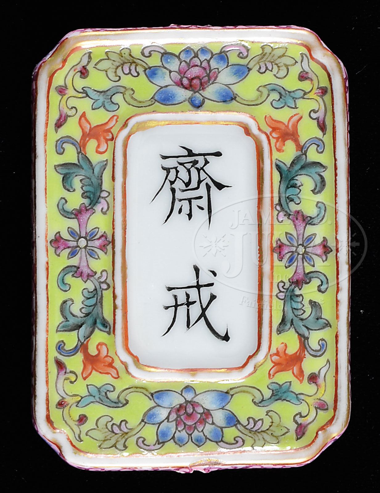 PORCELAIN PLAQUE. 19th century, China. Rectangular form. Famille rose enamel, borders with an inscription in Chinese and Manchu. SIZE: 2-1/4″ l x 1-1/2″ w. CONDITION: Very good. 9-91080 (400-600)