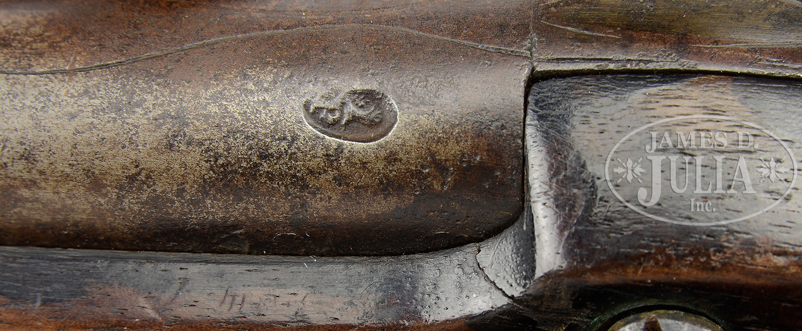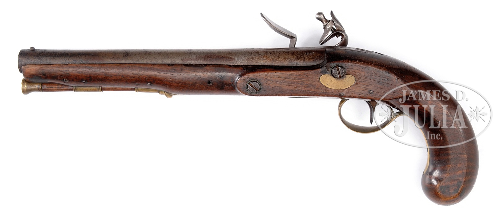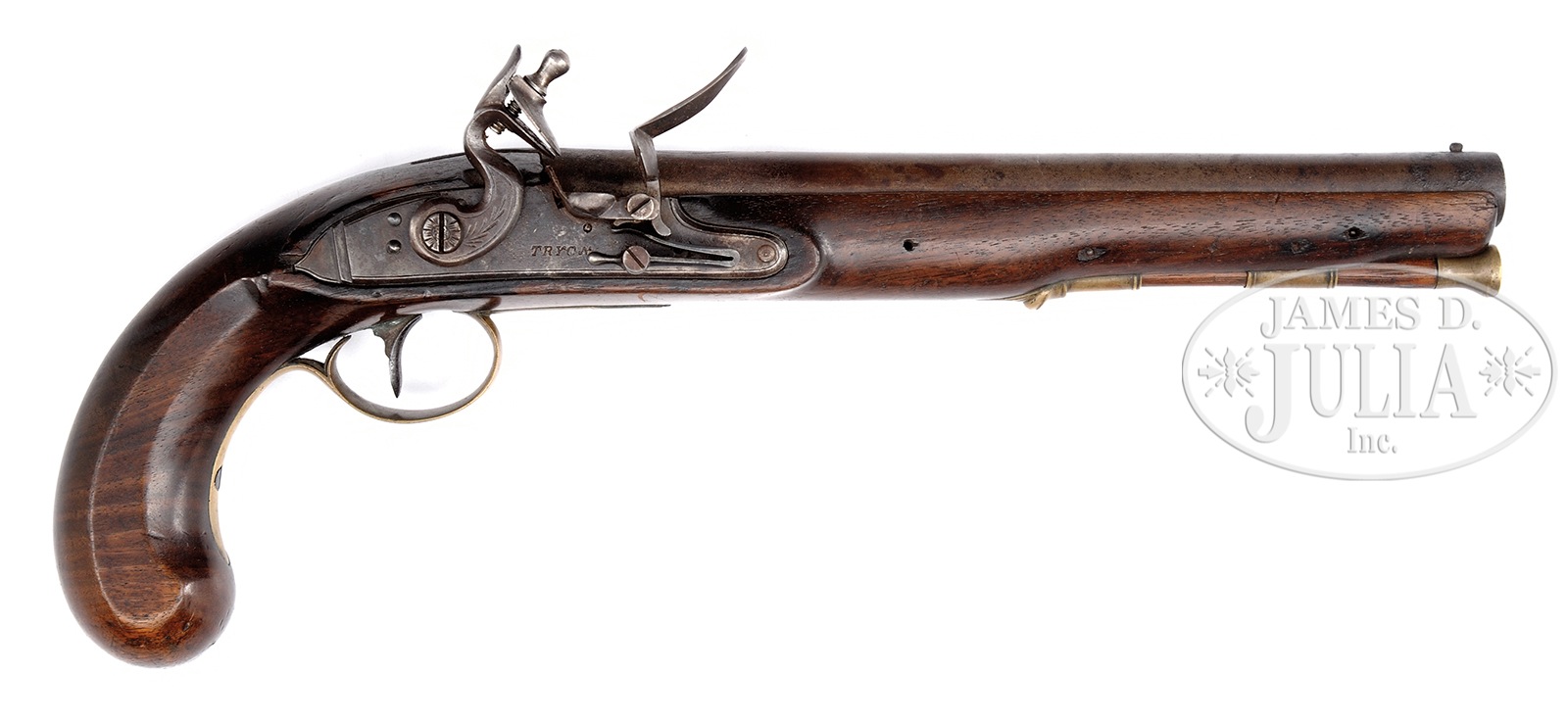 FINE AND VERY RARE, POSSIBLY UNIQUE, TRYON “WAR OF 1812” ERA MARTIAL PISTOL.SN NSN. Cal. 64. This gun which follows Model 1807-1808 contract pistols by other makers which were sold mostly privately and to state militias, 15″ overall with 10″ rnd bbl. Lock is marked “TRYON” forward of lock, brass mounted like Kentucky pistol with no buttcap. According to Jim Wertenberger, who published in-depth information he researched in American Society of Arms Collectors bulletins, #43 & #63; “eagle head over P” bbl cartouche was discontinued in 1813. This gun exhibits this proof and from The History of a Business Established 100 Years Ago by Charles Z. Tryon “Mr. Harrison the Navy Agent was directed on April 18, 1814 to send 15 repeating swivels, 50 muskets and 50 pistols to Commodore Chauncey on the Great Lakes in order to test their use in Active Service.” This gun could quite likely be one of these 50. It is also known that the U.S. Government supplied stocks to various contractors including Tryon for these pistols. Militia guns by Tryon are typically known in 50 Cal.; it should be noted that the 1808 Simeon North contracted navy flintlock pistol is also in 64 Cal. This particular gun is not shown in any text we are aware of. This is a beautiful example complete and orig, even retaining its orig brass tipped ramrod with iron worm. CONDITION: Fine overall, appears orig and complete in every regard. Iron is dark with patina, overall grey to brown; brass mounts have smooth mustard colored patina. Stock is sound and well fit, overall very good with hand worn patina and small chip just rear of lock with 1″ hairline at that point and another opposite lock at escutcheon screw. Mechanically functional with clear, pitted bore. 50731-5 JS (5,000-8,000) – Lot 4348