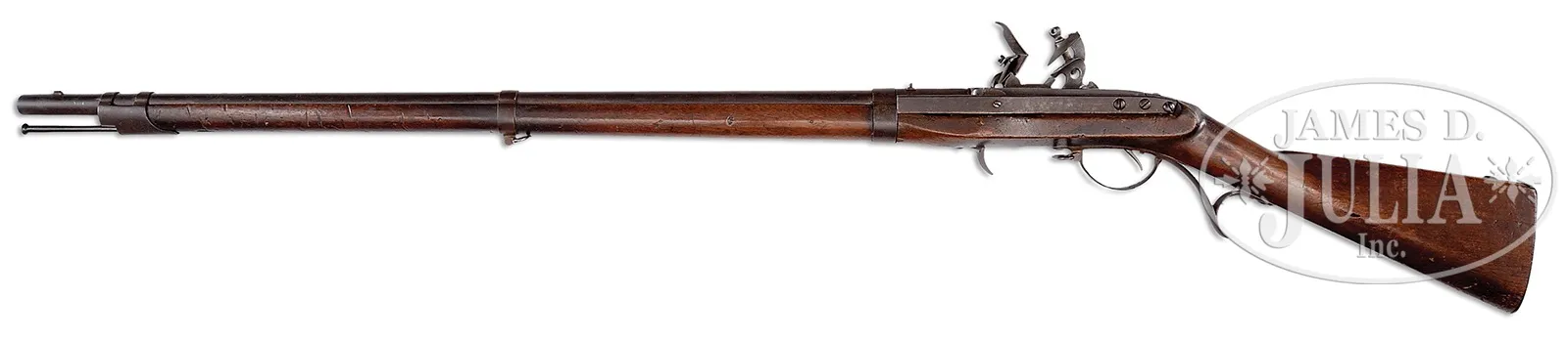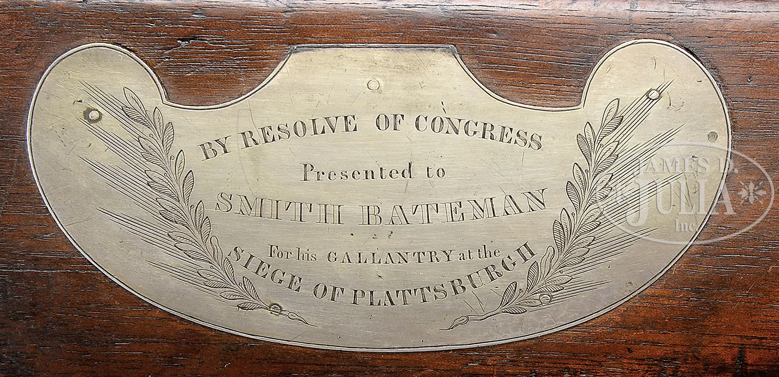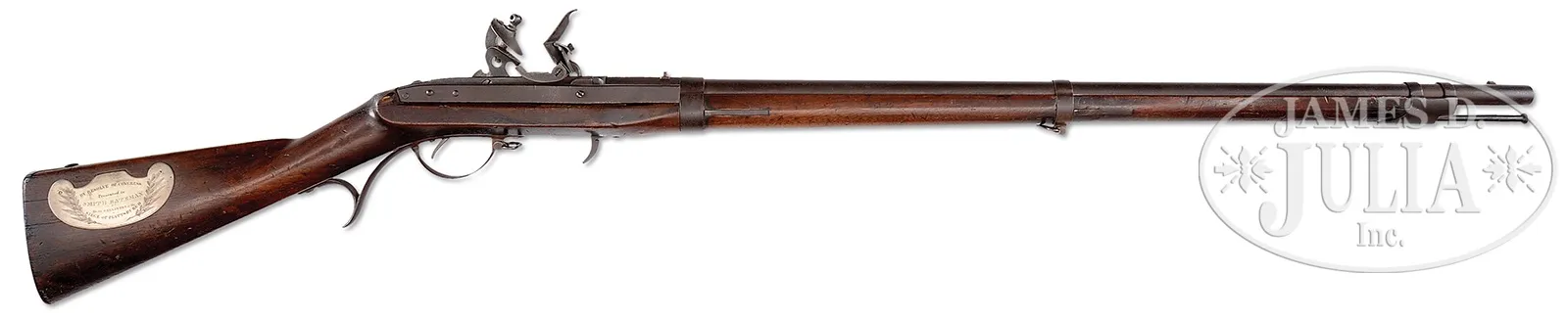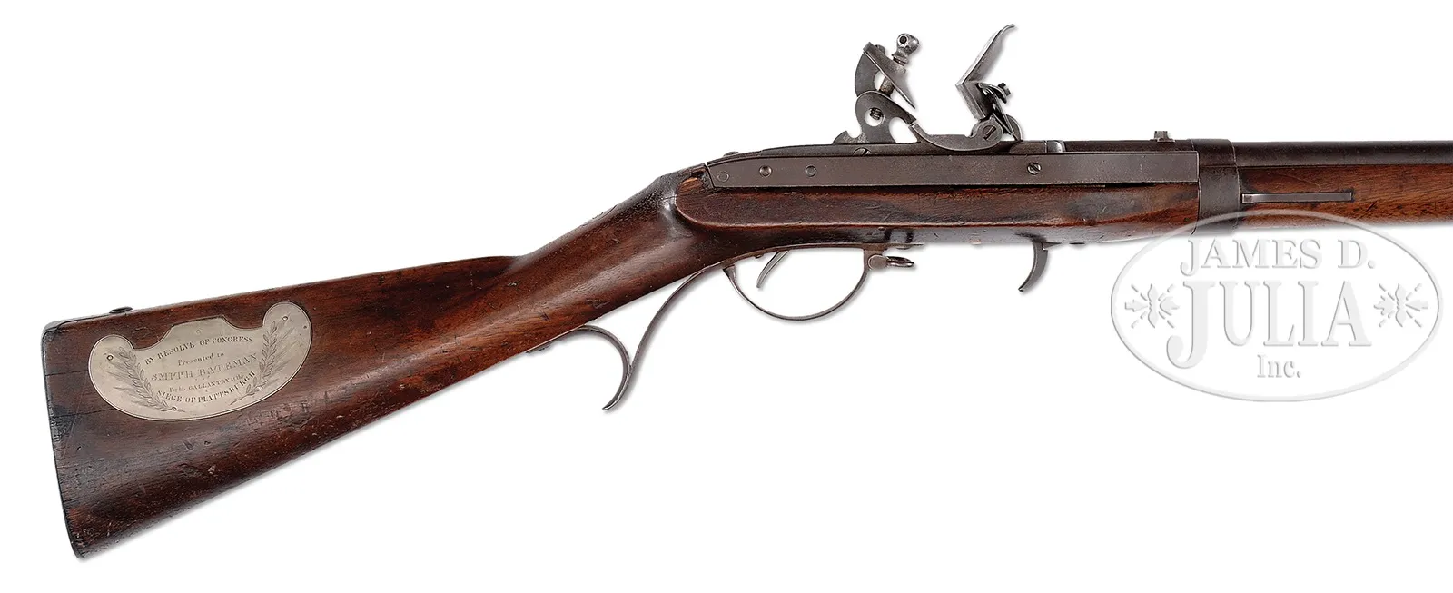 EXTREMELY RARE “WAR OF 1812” CONGRESSIONAL PRESENTATION MODEL 1819 HALL BREECH LOADING FLINTLOCK RIFLE.SN NSN. Cal. 54. This rifle presented to Smith Bateman was one of 17 presented to group of young boys who defended the bridge at Plattsburgh, NY September 11, 1814 during the Battle of Lake Champlain. These mid-teen schoolboys along with other militiamen showed phenomenal heroism in preventing the British from crossing over the Saranac River against a vastly superior British force of battle hardened veterans. These boys’ exploits were well known in Upstate NY and were finally awarded the newest and finest guns in the American arsenal fully 14 years after the event though Congress had authorized fine rifles for presentation much earlier. The boys were originally armed with poor muskets loaned at the time of the fight, so the finest American military rifle of its day was apropos. This rifle is of the earliest configuration marked “JH HALL” on breech. Congressional presentation 4-1/2″ silver kidney-shaped plaque inscribed “BY RESOLVE OF CONGRESS/Presented to/SMITH BATEMAN/For his GALLANTRY at the/SIEGE OF PLATTSBURGH”. These are the only firearms ever awarded by Congress for gallantry. This is one of only 10 surviving examples, most in institutional homes. A most interesting entry found in the 1922 History of Oregon Illustrated, Vol. 3 cites a biography of Bateman’s maternal grandson “Among the possessions which Mr. Clancey values most highly is a gun given to him by his maternal grandfather, Hiram Bateman. It is a very valuable relic, having been used in the War of 1812, and was presented by the United States government, through acts of congress, to Mr. Clancey’s great uncle, Smith Bateman, in acknowledgment of his bravery. His father was shot down while defending the bridge at Plattsburg and the boy, who was then but sixteen years of age, at once picked up the gun and fearlessly took his father’s place, thus performing a notable act of heroism. The gun is said by experts to be one of seven now in existence. It is a breech loader and bears a memorial inscription. Collectors have offered Mr. Clancey large sums for the gun, but he has refused to see as he contemplates giving the gun to the Smithsonian Institution for safe keeping.” PROVENANCE: Hiram Bateman (brother of Smith Bateman); C. B. Clancey, Salem, OR (Grandson of Hiram Bateman); Norm Flayderman Collection; Everett G. Partridge Collection; David Kleiner; Stanley B. Smullen Collection, Worcester, PA. CONDITION: Very good overall. Metal retains much of its orig brown finish mixed with staining and pitting. Mechanically fine with crisp discernible Hall multi-groove rifling in bore. Stock is sound and solid with hairline along 2″ of ramrod channel rear of breech locking arm. Scattered small hairlines and small cosmetic bruising with hand worn patina. Inspector initial “WB” on bottom of comb. The silver thumbplate is the only restoration on this gun, otherwise 100% orig and authentic. 51060-1 JS (30,000-50,000) – Lot 4354 Click here to view provenance