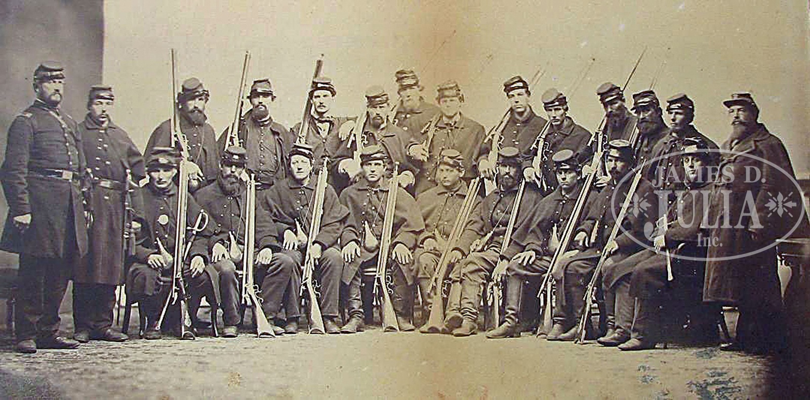 EXTREMELY RARE HEAVY BARRELED CIVIL WAR UNION SCOPED SHARPSHOOTER RIFLE.SN NSN. Cal. 44. 31-1/2″ oct bbl marked on top flat “JAMES & FERRIS, UTICA” with an additional mark “C. B. HOLDEN”. Mounted with 39″ brass scope, typical of Civil War with small field of vision. Brass patchbox has Massachusetts State seal engraved, most likely when sold by Cyrus B. Holden, circa 1861 of Worcester, Mass. James & Ferris were known makers of fine heavy bbl match rifles and Civil War sharpshooters rifles with “telescope sights”. This gun is most interesting in that it most likely saw Civil War service in that percussion nipple has been converted to a musket cone and contemporary replaced un-engraved hammer has been made to strike it properly. There are photographs of soldiers armed with such weapons, including soldiers of the 1st Massachusetts Sharpshooters. There is an example of a very similar weapon on display at Gettysburg National Park Museum and note photograph here of numerous soldiers with fairly identical guns, though ours has had the starter filled and removed. The 1st Massachusetts sharpshooters are among the few units of the Civil War that utilized heavy barreled guns, such as this one which weighs just over 15lbs, and most interesting that the Massachusetts State seal is found on this gun, more closely tying this gun to that unit. 1st Massachusetts had 39 casualties in the war, serving in almost every major battle of the Army of the Potomac during the war; note the identical rifle held by solider on their Gettysburg monument where the unit was engaged near Devil’s Den. This is a fine example of a rarely offered Civil War sharpshooters rifle. CONDITION: Very good to fine overall. Sound and solid with good surfaces. Rear adjustable scope mount has detached right ear and replaced screw. Scope is missing front lens and cap, though still retaining the “lollipop” style aperture instead of crosshairs. Brass retains smooth light mustard patina. Scope body also has a smooth copper/chocolate colored patina. Steel is overall grey with good edges and markings. Stock is sound and well fit, retaining much of its orig thinning varnish. Mechanically, gun functions well including adjustable trigger pull. Bore is clean with crisp rifling. 50815-1 JS (8,000-12,000) – Lot 4359