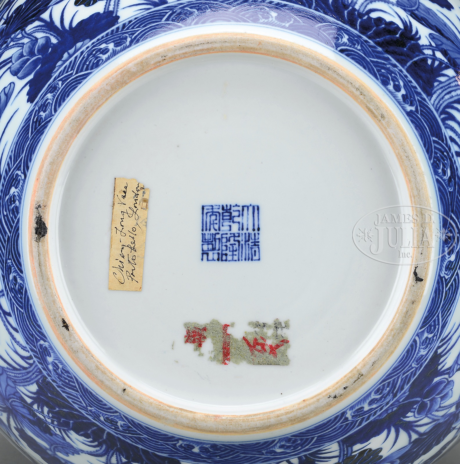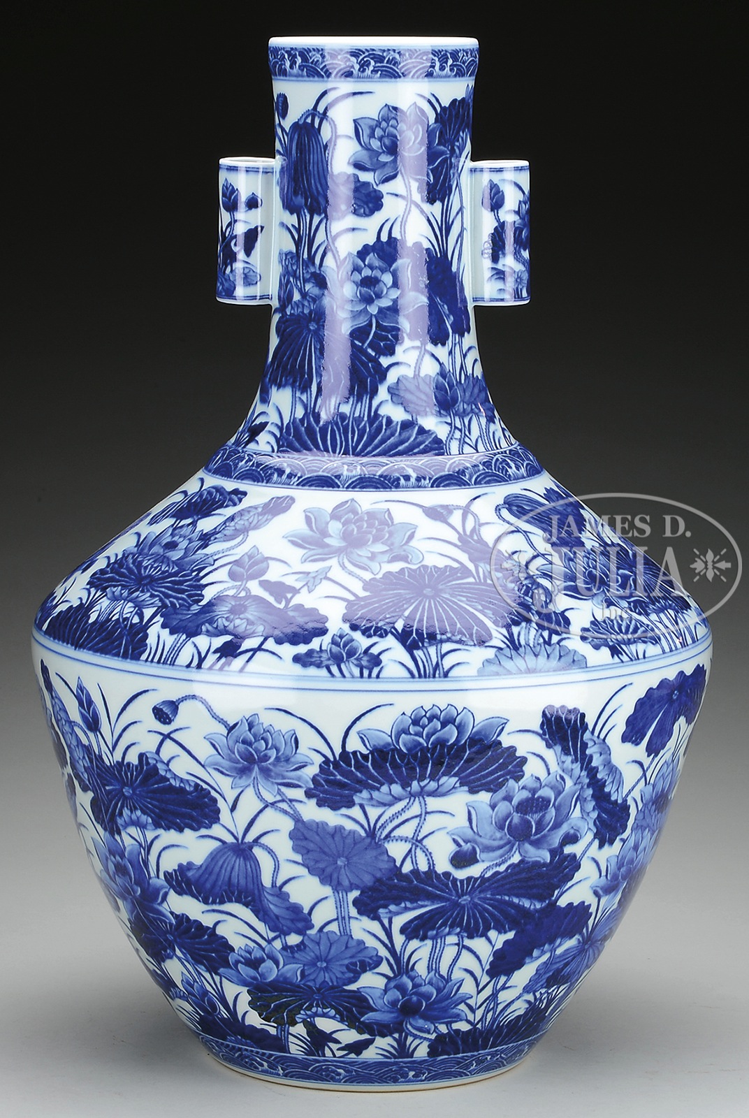 IMPORTANT PORCELAIN VASE.China, Ch’ien Lung 6 character mark and possibly of the period. Painted with underglaze blue decoration of lotus plants. NOTE: A similar example of blue & white vase with pierced handles decorated with lotus design with Qianlong seal mark can be found in “The Complete Collection of Treasures of the Palace Museum: Blue & White Porcelain with Underglaze Red (III) (Plate 130). For a Doucai version, refer to Sotheby’s New York Fine Chinese Ceramics, Furniture & Works of Art auction, May 31 & June 1, 1994, lot 403. SIZE: 21-1/2” dia. PROVENANCE: Acquired by the previous owner in London, 1997/1998. CONDITION: Very good. 9-91252 (30,000-40,000) – Lot 4361