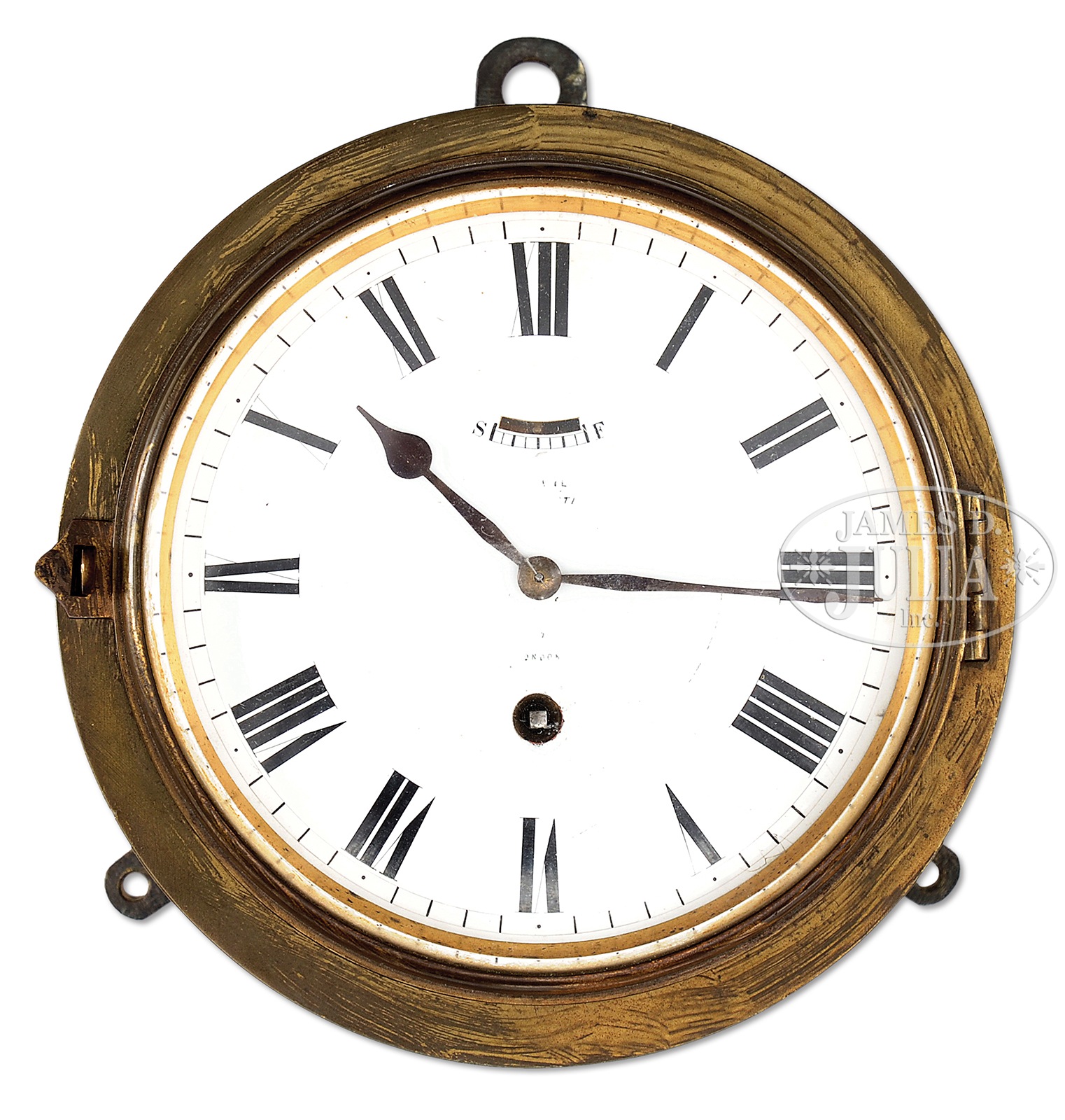 BRASS NAVAL CLOCK USED ON THE CSS ALABAMA, GREAT PROVENANCE AND HISTORY FROM DIRECT DESCENT OF CAPTAIN JOHN LOW, CSN.This wonderful preserved bronze cased bulkhead clock measures 7-1/4″ in diameter, 3″ deep, keeps amazingly good time and has direct family descent like pistols sold in the previous lot. When Professor Stanley Hoole (1903-1990) did his research in 1957 on the CSS Alabama, he found this clock along with the log books for the CSS Florida and the CSS Tuscaloosa owned by Miss Doreen Low, a teacher in Ascot, Berkshire, England. Miss Low, who never married, was Captain John Low’s granddaughter and her estate was sold by Sotheby’s Parke-Bernet in London, 1983. This clock was a rare commodity and valuable asset to 19th century mariners along with other nautical tools, such as sextants, telescopes and charts. This clock is not a gimbaled chronograph thought of as a nautical engineers tool, but was an important instrument to Captain Low as he no doubt used it on the CSS Alabama and later when he was Master of the Tuscaloosa and preserved it in the family. John Hamilton, in his August 1984 The Gun Report article, states that after the death of Captain John Low in 1906 “…the mementos he so treasured during his life passed to various members of this family. The historic pair of Colt 1860 Army pistols, which are the subject of the writing, went to one of his sons, Herbert A. Low, along with the ship’s clock. Miss Doreen Low, the granddaughter of Captain John Low, inherited them from her father, Herbert A. Low. They remained in the family for some 120 years and did not come to the open market until the property of Miss Doreen Low, deceased, was disposed of at public auction by Sotheby Parke Bernet & Co.” PROVENANCE: Lt. John Low, CSN, 1861; Herbert A. Low, 1906; Miss Doreen Low; sold at Sotheby Parke-Bernet, London 1983; Alan Beadle, London; John Hamilton Collection, 1984; Craig Hamilton. CONDITION: Very good overall. Working and only off by a few minutes while cataloging over a period of 8 hours. Consignor stated that his father John G. Hamilton had this clock professionally restored by a clock maker without changing its components. Clock appears externally, at least, all orig, including thick beveled glass lens and hand-painted enamel face. Has only partial makers mark and “LONDON” visible on porcelain dial. There are no internal markings on the solid brass mechanism. There is some chipping of enamel around keyhole. 51012-2 JS (6,000-8,000) – Lot 4363
