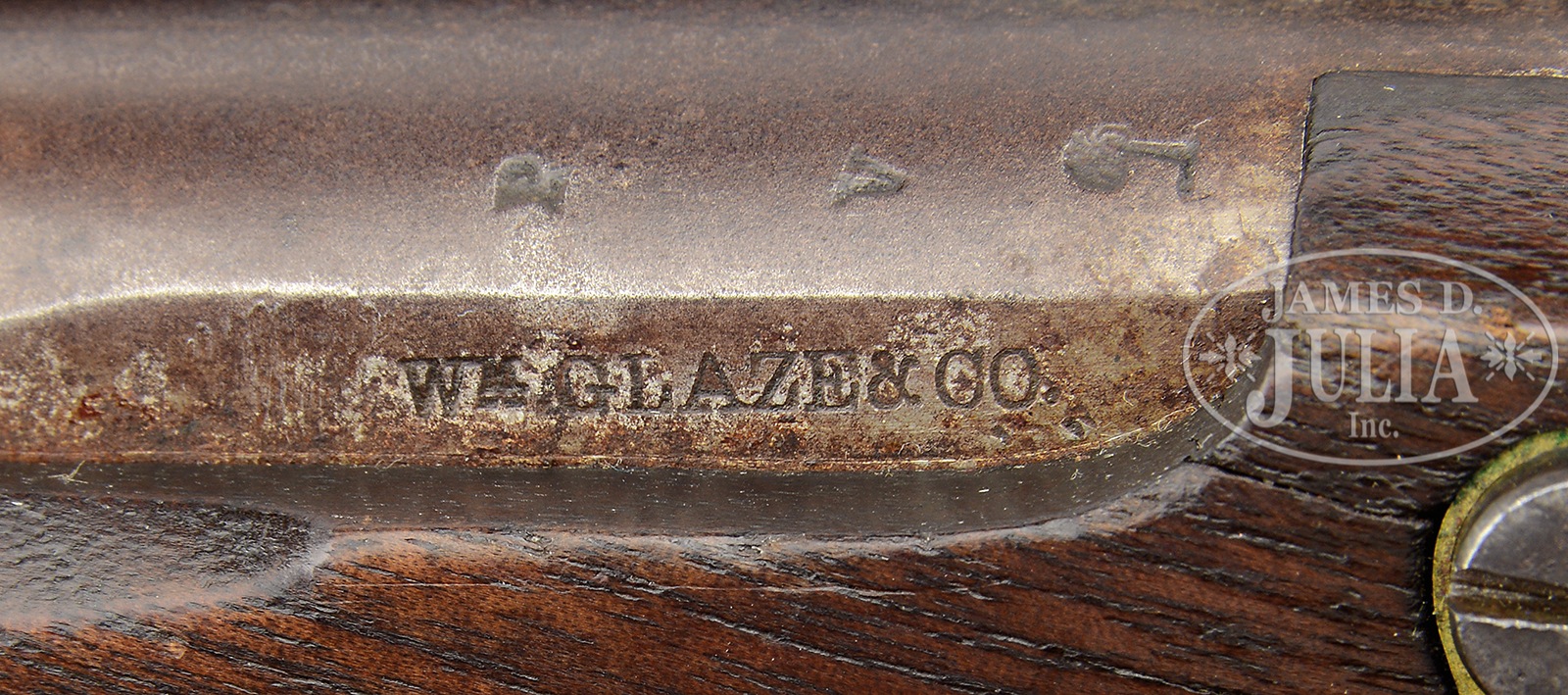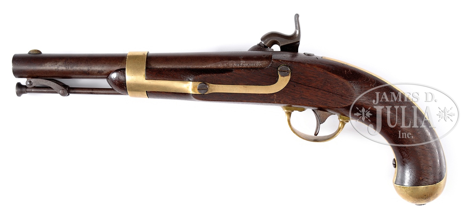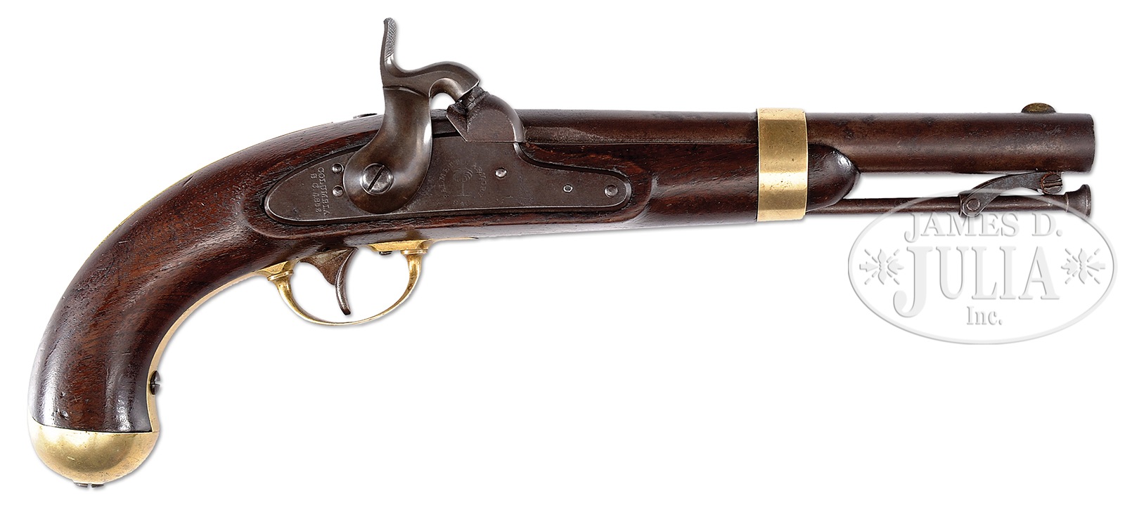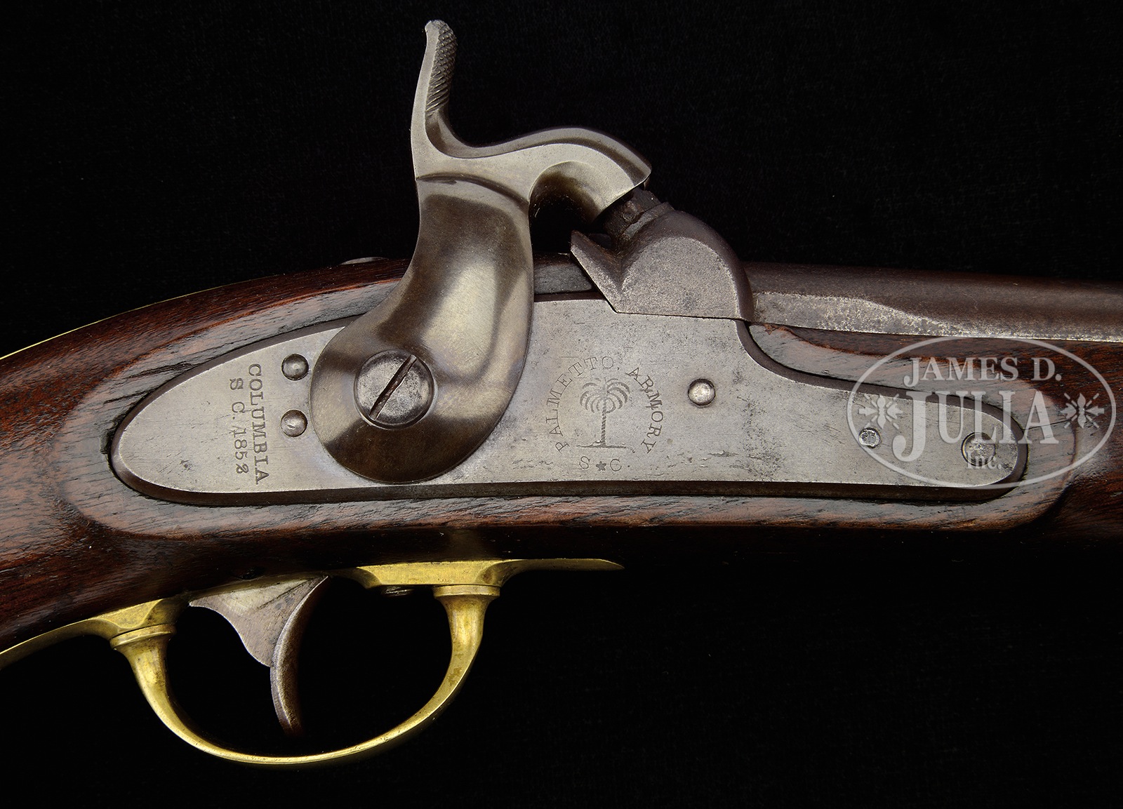 SN NSN. Cal. 54. This is the finest example of an orig Palmetto Armory secondary Confederate that has come to auction that we are aware. Only 1000 of this rare contract were purported to have been made and survival in fine condition is extremely rare. Markings are crisp and sharp. Gun is 100% orig and authentic and still retains bright orig brown finish on bottom of bbl and under bbl band. Dr. Fred Novy who has done considerable research on Palmetto arms over the last decade has found one of the distinct characteristics of these particular martials is that the bbls were browned. This brown however is quite fragile and is only seen on a handful of examples internally on uncleaned examples which are very scarce. Not only does this gun retain bright brown on bottom of bbl the entire surface of the bbl retains much of its orig brown. The lock and hammer have very crisp and fine markings and orig case colors in protected areas which is never seen. This would be a very difficult example to upgrade. Accompanied by a letter of authenticity and provenance from Dr. Frederick Novy. PROVENANCE: Ex-William Floyd Collection; Ex-Gary Bizacky Collection; Dr. Frederick G. Novy Collection. CONDITION: For a Confederate arm, this gun is in excellent condition. But by NRA standards it grades very good-fine. Bbl retains much of its orig thinning brown externally and bright brown in protected areas when disassembled. Lock is smooth and grey/plum overall with traces of case colors in protected areas and internally. Lock markings of “Palmetto Tree” surrounded by “Palmetto Armory, S.C.” are well struck and easily read as are “Columbia, S.C. 1852″. Bbl markings of “V/P”, “Palm Tree”, “Wm. Glaze” and “1853″ on bbl tang are crisp and easily discerned. Brass has a light mustard patina with scattered small scratches, dents and dings. The stock is sound and solid with good edges and a couple hairlines unaffecting aesthetics, hand worn patina with traces of old varnish. Mechanically gun is sound with a smooth bore with pitting. 50373-3 JS (10,000-15,000) – Lot 4364