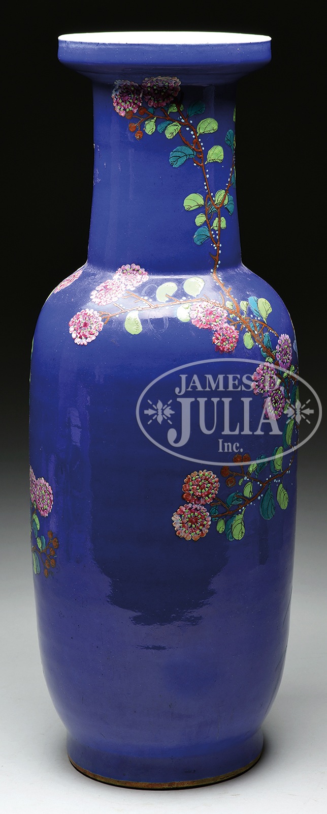 PORCELAIN VASE.Late 19th century, China. Rouleau form. Blue ground with decoration of flowers in famille rose enamels. SIZE: 24″ h. CONDITION: Very good. 9-91280 (1,800-2,800) – Lot 4365