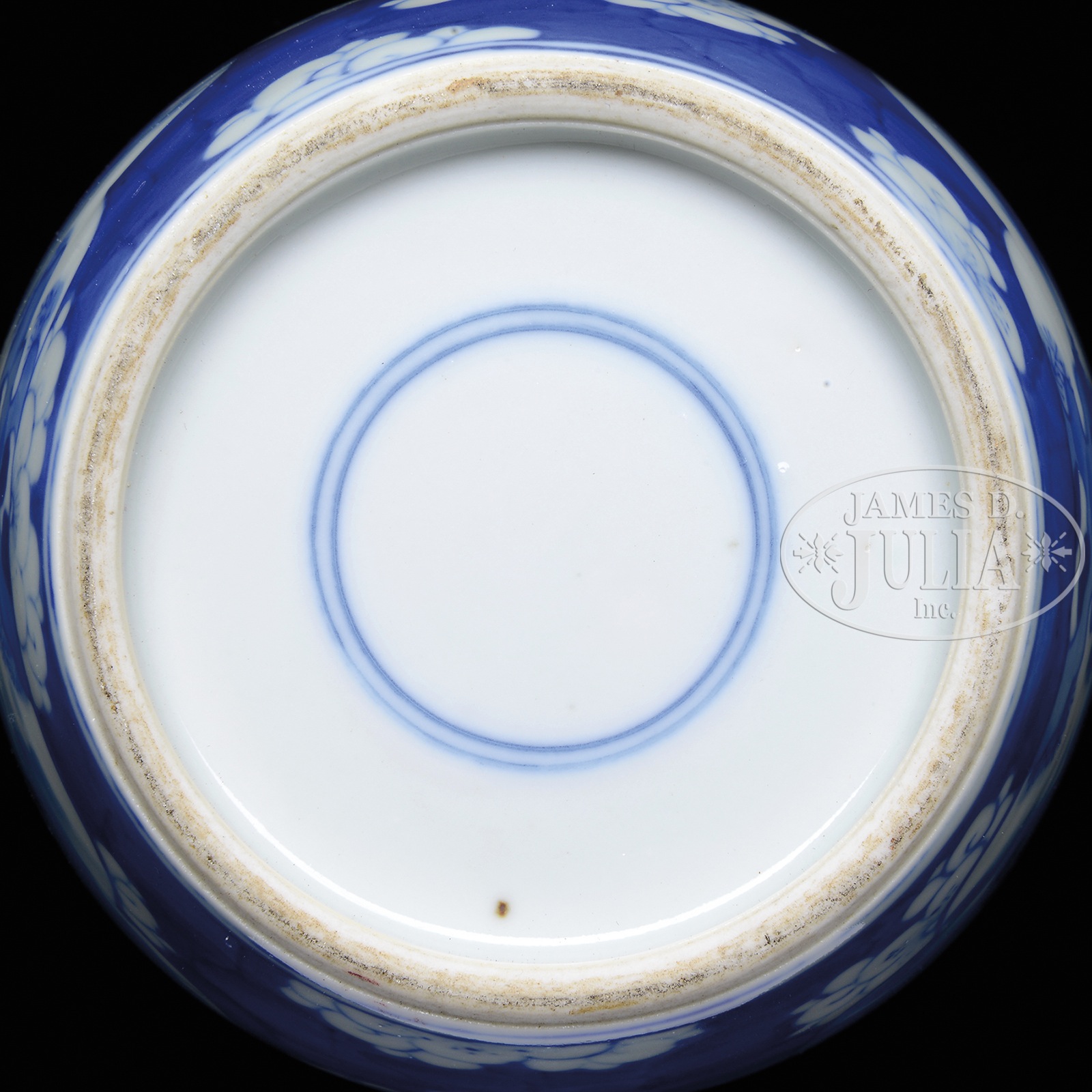 TWO PIECE LOT OF BLUE AND WHITE PORCELAIN.Late 19th century, China. The jar painted in underglaze blue with two large mirrored reserves depicting two figures in a landscape. The trim painted with prunis blossoms on cracked ice ground. Comes with original cover. The dish painted with a single central reserve of a bird perched upon a blossoming tree branch with butterfly flying overhead. The underside having a 4 character Kangxi mark. SIZE: 8-1/4″ h, 5-3/4″ dia. Plate 7-1/4″ dia. CONDITION: Jar is very good. Plate is very good. 49076-6 (300-500) – Lot 4370