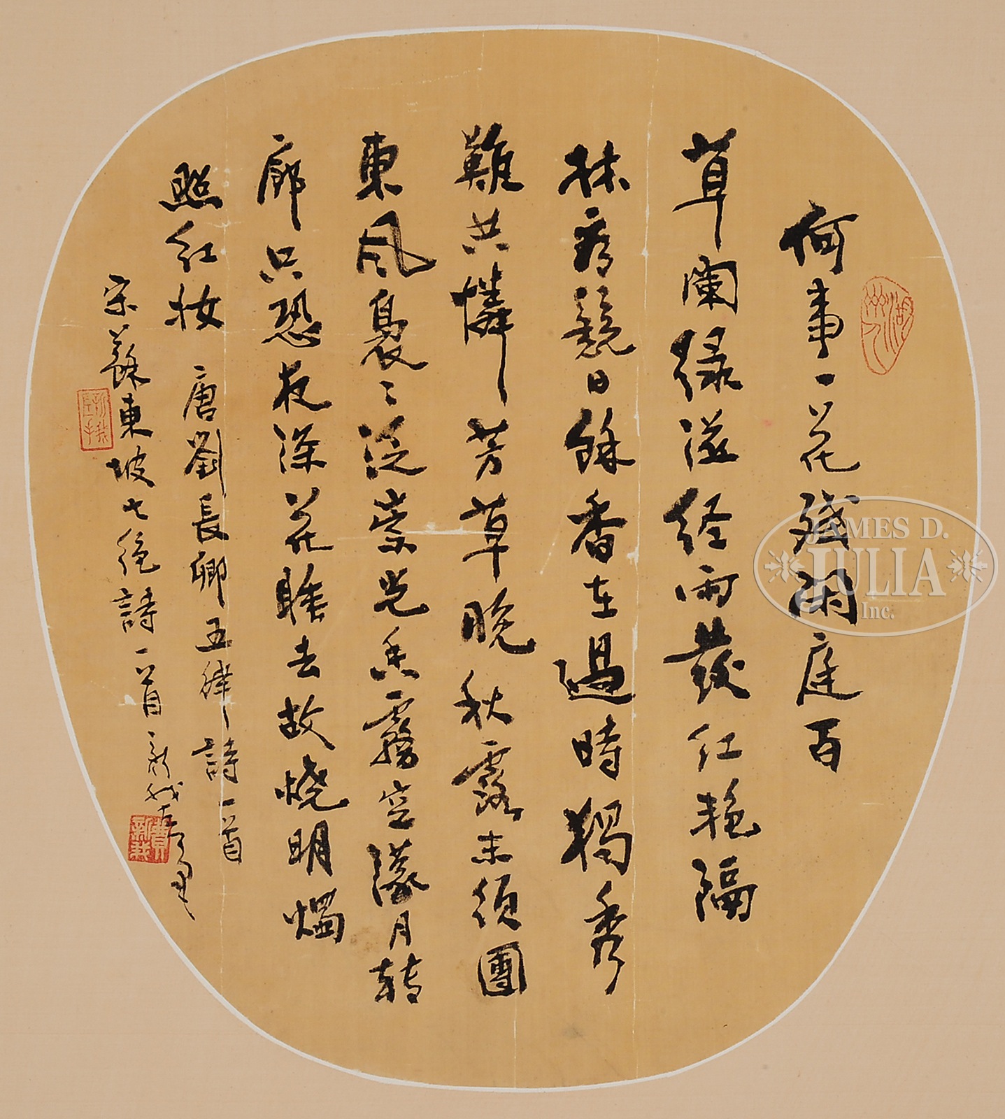 TWO CALLIGRAPHY FAN LEAVES ATTRIBUTED TO BAI JIAO(1907 – 1969).China, one in standard script, signed, dated summer of renchen year, with two seals; the other in an oval fan shape with calligraphic inscriptions in running script on silk, signed, with three seals. SIZE: 6 ¼” x 18 ¾”, 12 ¼” x 10 ¾” CONDITION: Minor loss, surface grime. 9-91107 (600-800) – Lot 4378