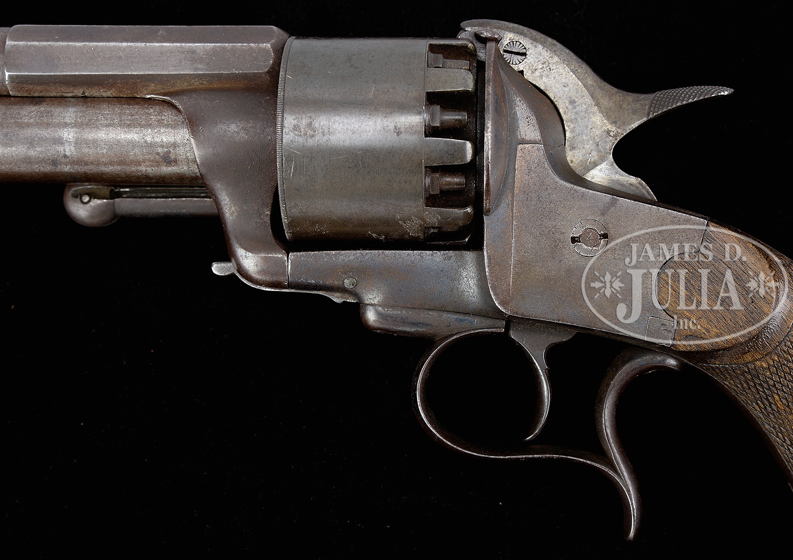 RARE AND VERY FINE “AS FOUND” EARLY 1ST MODEL LEMAT CONFEDERATE REVOLVER FRESH TO MARKET.SN 178. Cal. 42/18. This is a fine and complete orig example of a rarely offered 1st Model LeMat just discovered in a New York estate and was unknown to collecting community until now. The family has no idea of where the gun came from, but know that it has been in the family for a very long time. Ironically, this gun is only a few SNs removed from several famous identified LeMat revolvers. This gun has all the rare 1st Model features, including earliest bbl markings of “COL. LeMAT’S PATENT”, loading assembly attached to bbl on right side of gun, spur trigger guard and pinned lanyard ring stud, reciprocating pin cylinder rotation system. This gun is all orig, complete and functional. SN “178” is found on every part where SN’s are normally found including shotgun bbl, loading arm, frame and cylinder. 1st Model LeMat’s are rarely found today, especially complete with loading assembly, of which there are probably no more than 10 or 20 fine examples known. There are several 1st Model LeMat’s in various museum collections identified to important Confederate personalities, such as P.G.T. Beauregard (SNs 8 & 427), Maj. Gen. John Lewis (SN 88), Stonewall Jackson (SN unknown), JEB Stuart (SN 115) and Henry Wirz (189), Commander of Andersonville Prison. SN 183 just 5 SNs apart from subject gun was captured on the CSS Florida. PROVENANCE: Estate of Norman Weiss, New York. CONDITION: Fine overall. Strong traces of orig blue finish on bbl, cylinder, frame, trigger guard and backstrap, with balance a dark plum/grey. Gun was not disassembled, but appears all orig and matching with exception of one professional restored screw. Stocks are crisp, well fit with light diamond point wear and scuffing, hand worn patina. Mechanically crisp with defined bores. 50949-1 JS (25,000-30,000) – Lot 4379