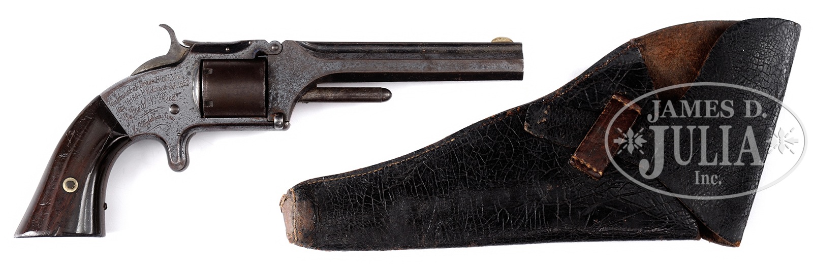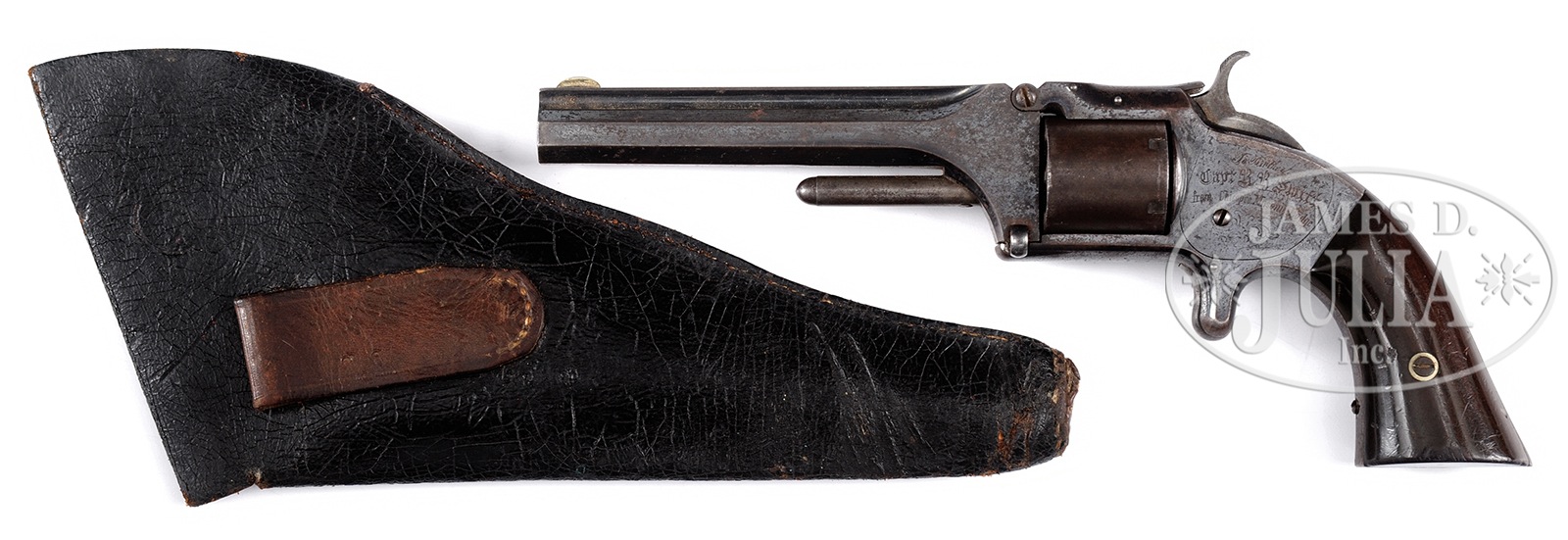 RARE AND VERY FINE EARLY 2-PIN S&W OLD MODEL ARMY REVOLVER WITH DOUBLE INSCRIPTION OF PRESENTATION, CAPTURE AND RETURN BY MAJOR SAMUEL REID, 3RD ARKANSAS INFANTRY.SN 648. Cal. 32. This early Smith & Wesson Army revolver is inscribed on left side frame “TO BROTHER CAPTAIN R R SWIFT FROM CHICOPEE MASONIC LODGE”. Ripley R. Swift enlisted as a Captain in the 27th Massachusetts, October 16, 1861″. He was wounded March 14, 1862 at Battle of New Berne, NC by a grapeshot to his leg. He was carried from the field to “a small Negro hut”, a temporary hospital where he remained 4 days. After almost 3 months in the hospital, Captain Swift rejoined his regiment December 20, and served as Provost Marshal for 2 months. The 27th moved from Carolina to Virginia and took part in actions with Butler’s advance up the James. “Early in the morning of May 16th, Heckman’s Brigade of which the 27th formed a part was attacked by a superior force of the enemy, and after (unreadable) engagement was forced to fall back with a loss of capture of parts of 7 Co’s of the 27th. Capt. Swift was among the captured. Taken first to Richmond where he was robbed of all his money, he remained in Libby Prison til June 1st; thence to Macon, Ga., where he lay two months; thence to Savannah, Ga., where he continued nine weeks; thence to Charleston where he was placed in the Charleston Jail under the federal fire; here he was confined three weeks; thence to Columbia, S.C., in which place he was a prisoner 4-1/2 months; thence, on Sherman’s advance toward Columbia, he was transferred to Charlotte, N.C., thence to Greensboro and Raleigh, thence to Goldsboro, at which places he continued in aggregate 10 days. From Goldsboro he was taken to a point within 10 miles of Wilmington, N.C., at which he was exchanged”. The right side of frame inscribed “CAPTURED AT [DREWRY’S] BLUFF, VA / MAY 16 1864 & RETURNED OCT. 1865 BY BRO. S.V. REID / MAJ CONFEDERATE ARMY”. Samuel V. Reid according to attached records shows he was indeed at Drewry’s Bluff for the date of the gun’s and Swift’s capture. What an interesting history of a Massachusetts Mason having his captured pistol by a fellow “Brother”. Co. H, 3rd Arkansas “The Orphan Company”, a fledgling company of only 33 volunteers while on their way to Virginia met Samuel V. Reid of Kentucky who had brought 30 of his fellow Kentuckian’s down to Tennessee, looking for a regiment to attach themselves to. “It was proposed that the two groups of volunteers joined forces to fit out a full company for the 3rd Arkansas. The commissioned and non-commissioned officer appointments would be equally divided among the two groups, with Reid becoming captain and Gibson becoming 1st Lieutenant. Accordingly, the Kentuckians enlisted at Nashville on June 10; the Arkansans enlisted at Tyro on June 15; and the new company traveled to Lynchburg, Virginia, where it was assigned to the 3rd Regiment, Arkansas Volunteers, as Company H, July 1861. Colonel Albert Rust, regimental commander, referred to the company as “my orphans”, a name which the men adopted as “The Orphan Company”. In keeping with its cosmopolitan nature, Company H recruited quite a few Virginians during the war. During its four years of service, 116 men served in Company H, only nine of them remained when the company surrendered at Appomattox Court House.” This is a rare and very fine, early Smith & Wesson Army accompanied by its well fitting military-style flap holster. A file of research accompanies. CONDITION: Fine overall, all matching. Frame and bbl retain over 50% of their bright orig blue finish. Stocks are sound and solid, retaining most of their orig varnish with a longitudinal glued crack repair on right stock. Mechanically gun is fine with crisp, well defined bore, slightly wobbly at hinge pin. Holster is in matching fine condition with craquelure, some bending and folding around plug end. 50984-1 JS (10,000-15,000) – Lot 4386 Click here to view provenance