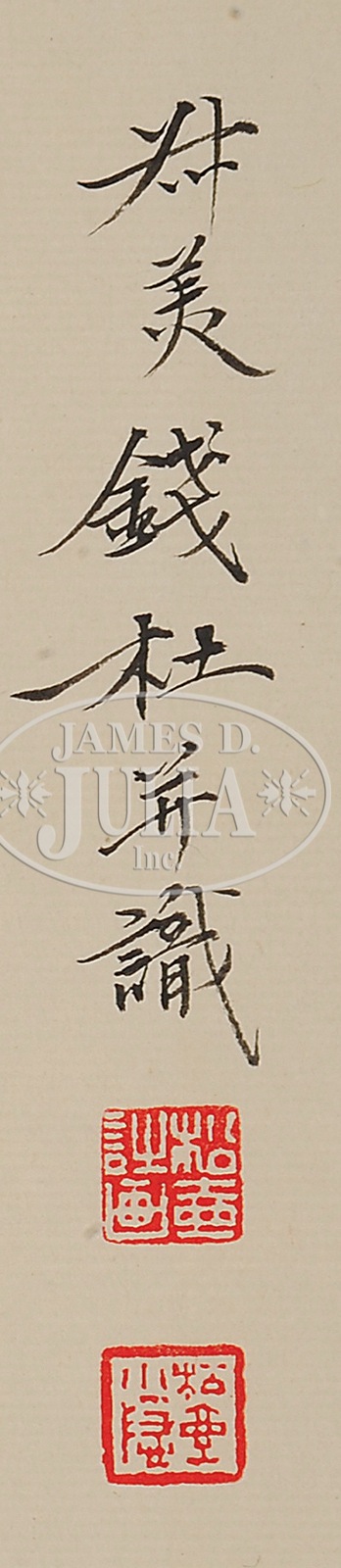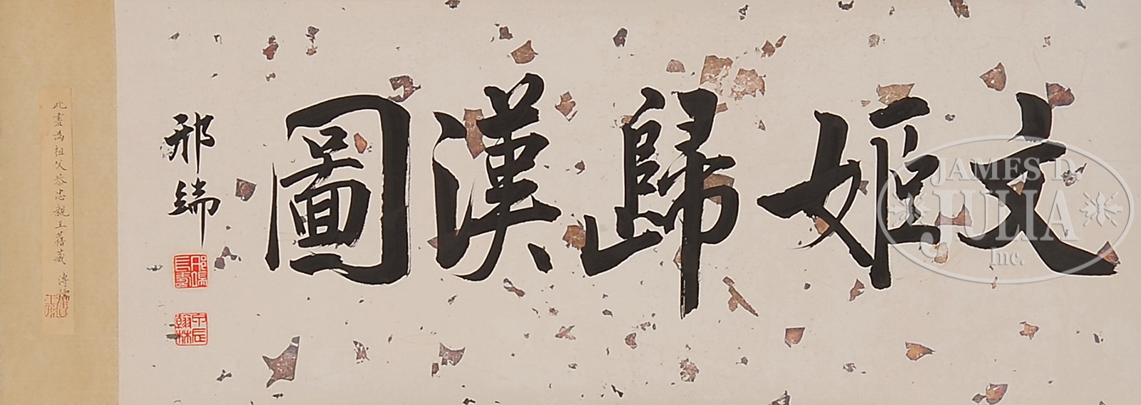 HANDSCROLL ATTRIBUTED TO YU ZHIDING (1647-AFTER 1709) OR LATER PERIOD.China, ink and colors on silk, finely depicting Cai Wenji returning to her homeland, signed “Yu Zhiding,” with two seals; frontispiece inscribed, signed “Xing Duan,” accompanied by colophons signed “Qian Du” and “Yang Jin.” Note: A slip attached to the frontispiece reads “in the old collection of grandfather Prince Gongzhong, Pu Ru.” SIZE: 11” x 73”, 11” x 27”, 11” x 35” CONDITION: Good condition, surface grime, minor stain. 9-91225 (2,200-2,800) – Lot 4396