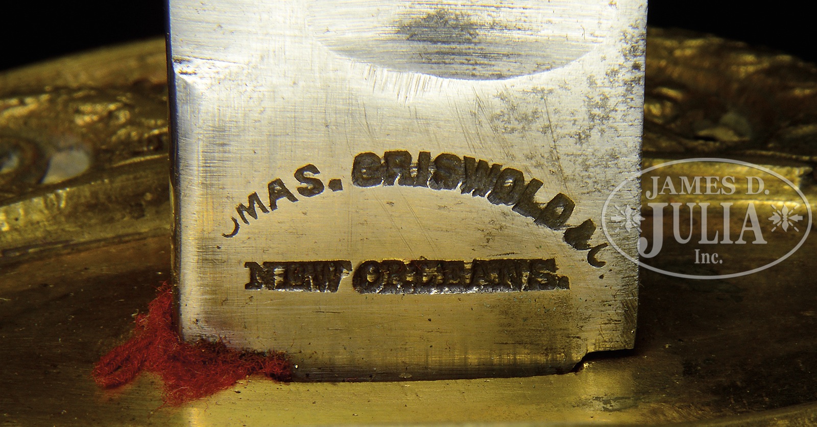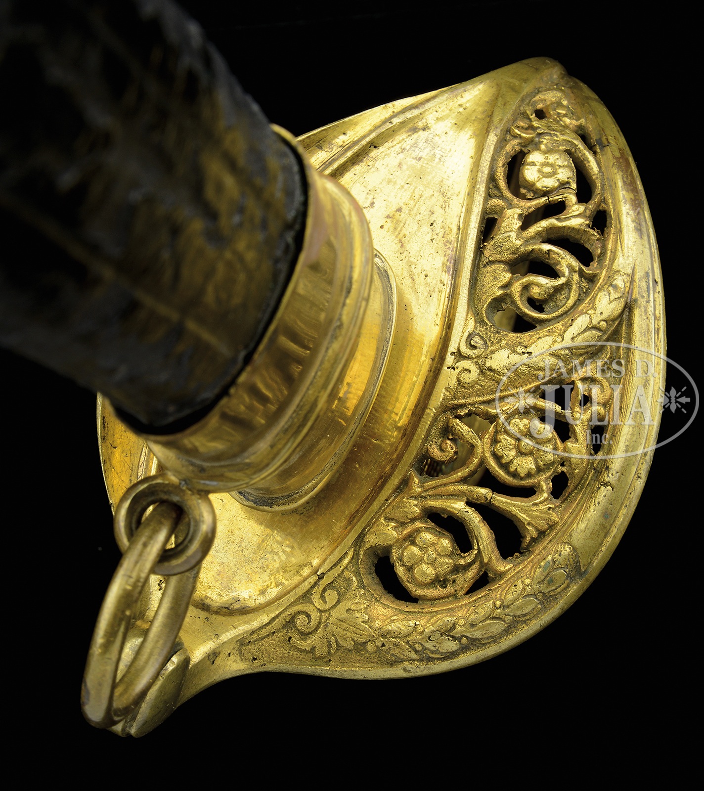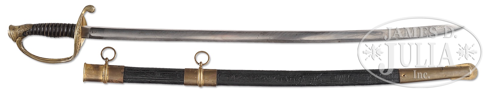 EXTREMELY FINE CONFEDERATE THOMAS, GRISWOLD NEW ORLEANS FOOT OFFICER’S SWORD.This is probably the finest Thomas, Griswold foot officer’s sword extant. Sword exhibits bright polished blade with original polishing marks over most of its length with very fine grip retaining original leather, wire, much original gilt to hilt and mounts. Thomas, Griswold artillery and cavalry sabers are much more often encountered than this pattern and I have never seen a nicer standard production example. CONDITION: 29-3/4″ blade exhibits most of its original polish and luster, overall white/gray with areas of staining and 3 small nicks in cutting edge. Firm name is well struck though die was slightly larger than blade as can be seen in photo. Grip leather is complete with tight twisted brass wire with wear and light scuffing to high areas. Much original gilt is present especially in protected areas of hilt and mounts. Scabbard is sound and solid with slight shrinkage though still fits sword well and snugly, mounts are very good with 1 small dent in drag, drag is missing its retaining screw. Leather scabbard body is chipped and missing much of its original surface though still aesthetically pleasing being dyed black which covers most of the scuffing. 50412-53 JS (15,000-25,000) – Lot 4400