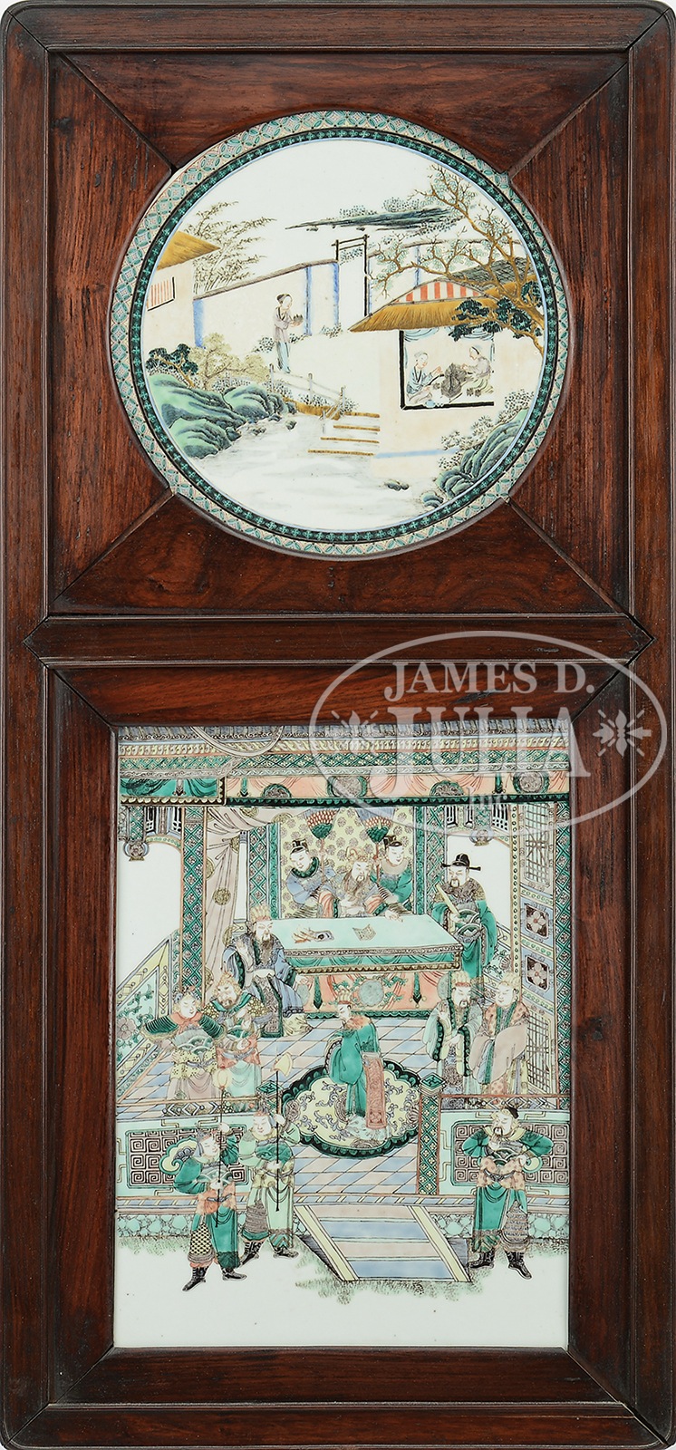 PAIR OF PORCELAIN FAMILLE ROSE WALL PLAQUES.19th century, China. Rectangular and round porcelain plaques inset with rosewood frames with brass mounts. Famille Rose decoration of two agricultural scenes, the 100 deer motif, and an historical scene. SIZE: Overall each is 37-1/2″ h x 17″ w. CONDITION: Very good. 9-93183 (2,000-3,000) – Lot 4401