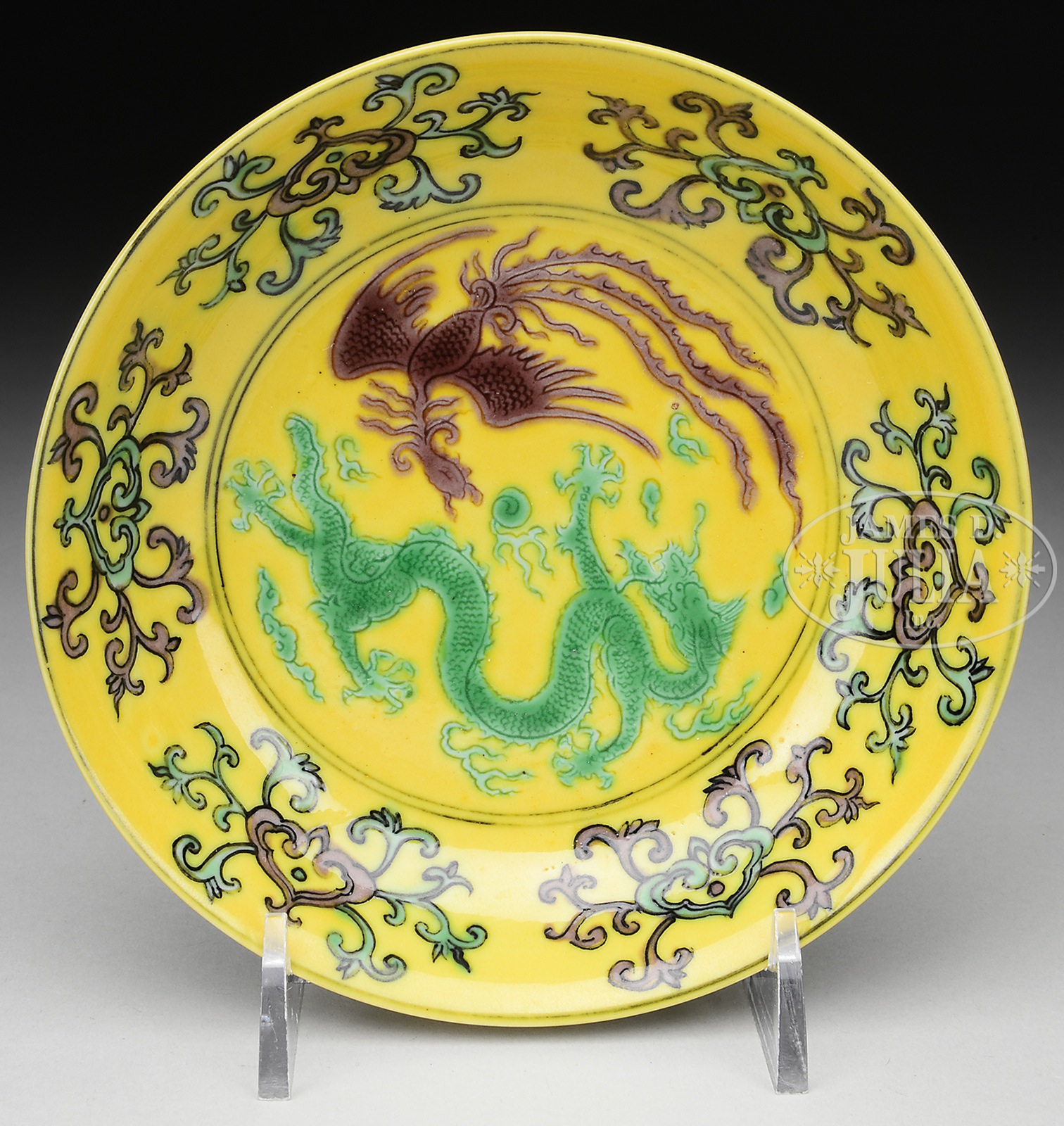 YELLOW PORCELAIN SAUCER DISH.Late 19th century, China. Mustard ground with green and aubergine phoenix and dragons and ju-i. 6 character Ch’ien Lung seal mark on the base. SIZE: 4-3/4″ dia. CONDITION: Very good. 7-74991 (200-300) – Lot 4411