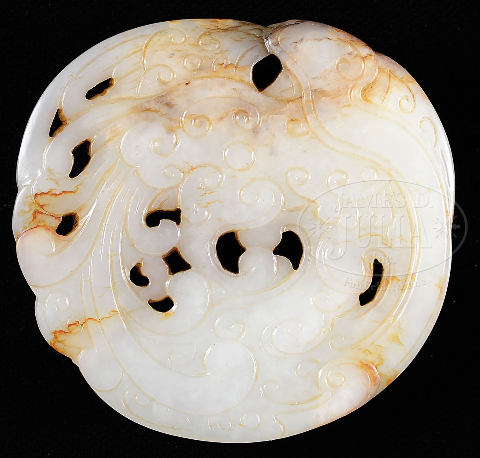 JADE PENDANT. 18th century or earlier, China. Pendant of white jade with russet markings, carved in archaic style of phoenix and dragon. Within fitted box. SIZE: 2-1/4” t x 2-1/4” w. PROVENANCE: From a private Southern collection. CONDITION: Very good. 9-91742 (400-600)