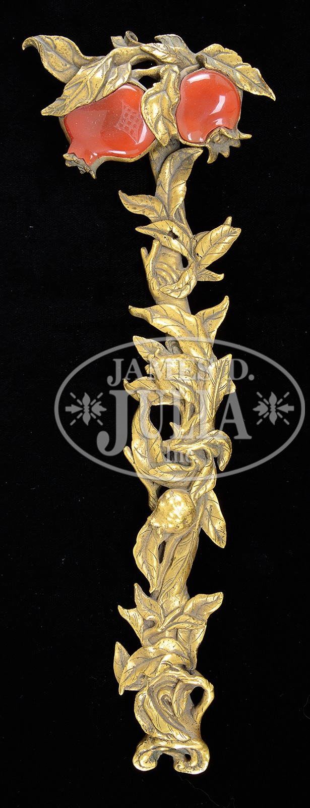 GILT BRONZE SCEPTER WITH INLAYS.Cast as a leafy branch with two pomegranate growths, the terminal with two inlay pieces of carnelian. SIZE: 12-1/2″ l. CONDITION: Good with wear to gilding. 1010-8 (800-1,200) – Lot 4415