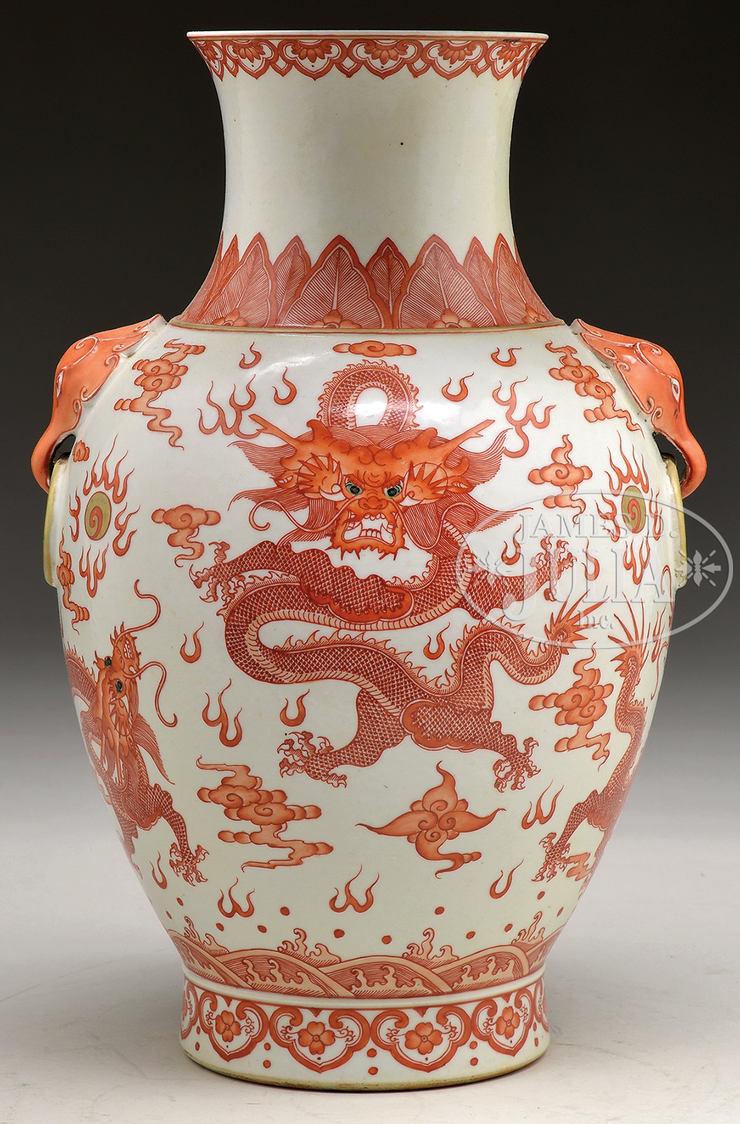 IRON RED PORCELAIN VASE.20th century, China. Decoration of dragons and clouds with borders of Ju-i and acanthus leaves. Elephant mask faux jump rings. 6 character Tau Kuang seal mark. SIZE: 10″ dia x 16″ h. CONDITION: Very good. 7-74870 (200-300) – Lot 4421