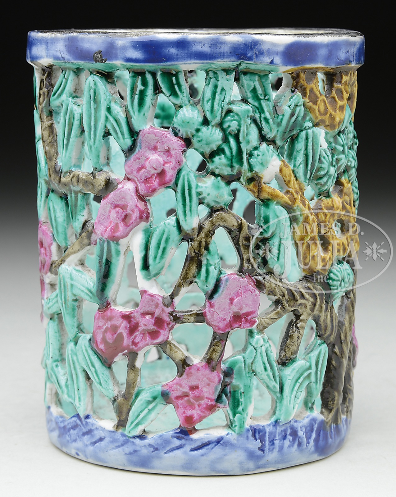 PORCELAIN CYLINDRICAL BRUSH POT.18th/19th century, China. With molded and pierced decoration of the “three friends” pine, prunus, and bamboo. Surface decorated with magenta, blue, green, and brown enamels. SIZE: 4-1/2″ h x 3-1/2″ dia. CONDITION: Kiln flaws on the rim, otherwise good. 42260-54 (300-500) – Lot 4421