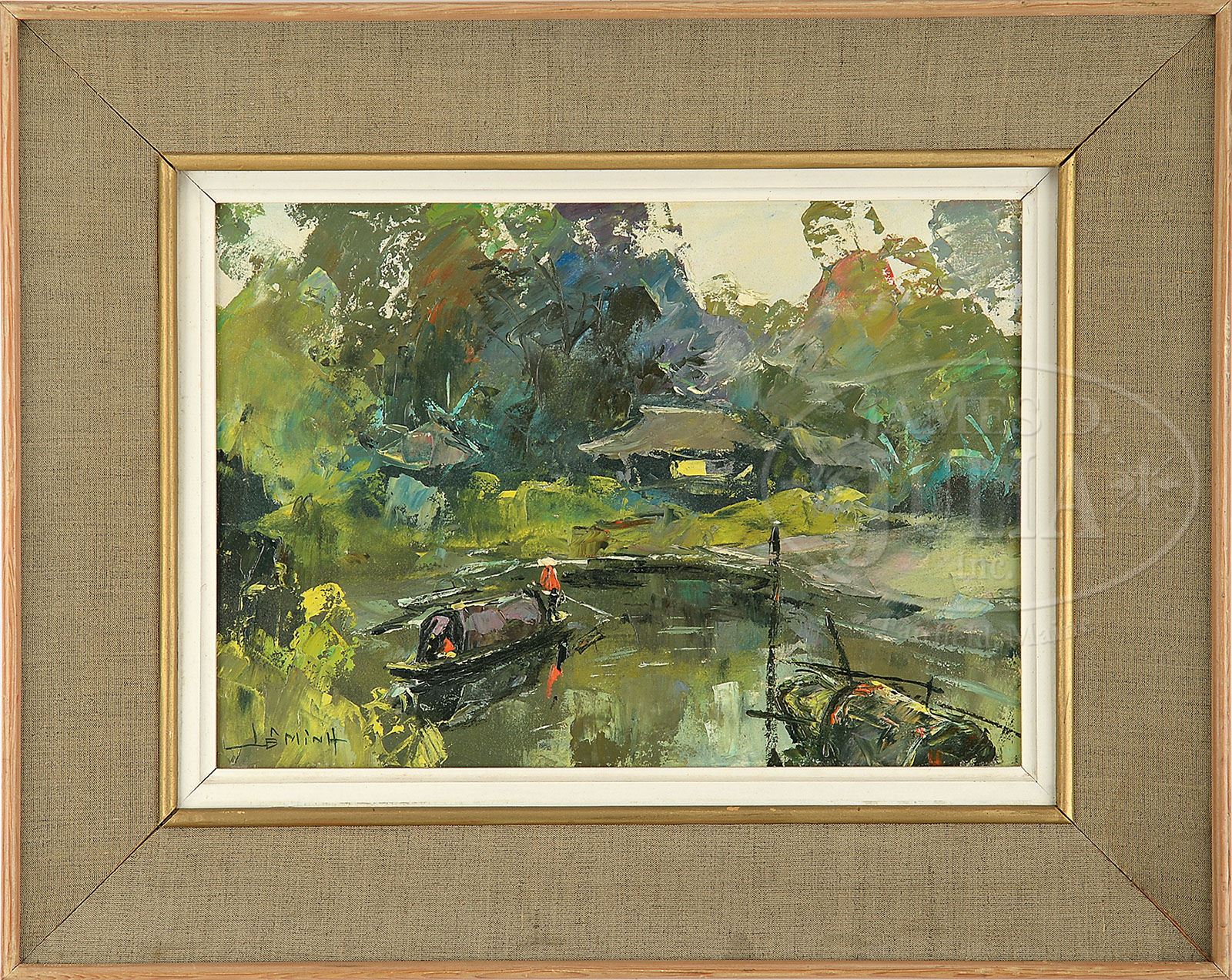 TWO VIETNAMESE OIL PAINTINGS. 1) Oil on canvas, village scene with figures and huts, signed lower left “Phung”, housed in a decorative wood and linen frame. 2) Oil on canvas, shows a river with boat and house amongst trees, signed lower left “Le Minh”, housed in a decorative wood and linen frame. SIZE: 1) 16″ x 13″. Overall: 24″ x 21″. 2) 13″ x 18″. Overall: 21″ x 26-1/2″. CONDITION: Both are very good. 7-74319 (300-500)