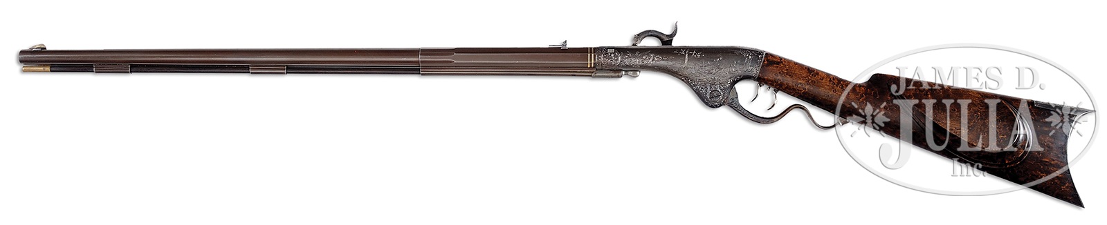 SPECTACULAR AND UNIQUE WILLIAM MARSTON’S PERSONAL PRESENTATION GUSTAV YOUNG ENGRAVED BREECH LOADING PERCUSSION RIFLE.SN NSN. Cal. 36. 45-1/2″ overall. 25-13/16″ oct to 16-sided transition to rnd bbl. Top of frame engraved “W.W. MARSTON, PATENTED 1850, NEW YORK”. Gun is finely scroll engraved most likely by Gustav Young on the frame, hammer, breech & breech tang, buttplate, toe plate, trigger guard/lever, screw heads and rear ramrod thimble. Large panel on obverse of frame shows a rampant wolf and reverse has woodland scene showing a buck and doe. Both these panels are shown in Nimschke’s book of patterns. Nimschke has an “X” next to each denoting that they were not his work; several other engraved panels marked with “X” are known to be Gustave Young. Regardless, this is an impeccable and beautiful rifle described by Doug Eberhart in his 1974 American Society of Arms Collectors bulletin, No. 30, as “Probably the finest rifle known…It is, by far the most decorated piece I have ever seen. In addition to the deluxe engraving, it has two gold barrel bands, at the breech, just as you might expect to find on a better grade of Philadelphia Derringer. This piece also has several other features that make it unique. The maker’s name and address…is engraved in script on the top of the frame, instead of being stamped on the left side of the frame…the ramrod is of rosewood instead of ash, as was commonly used.” Marston’s Model 1850 rifle’s are extremely rare with few examples known and this exquisite example is in extremely high condition retaining virtually all of its orig finish. PROVENANCE: William Walker Marston (1822-1872), circa 1855; Ex-Henry M. Stewart collection; The two panel scene engravings are shown on pg. 11 of “L.D. Nimschke Firearms Engraver”, by R.L. Wilson, 1965; Pictured and described in L.D. Eberhart article in “American Society of Arms Collector Bulletin” No. 30, 1974; Ex-Stanley Diefenthal Collection, New Orleans; Estate of Tig Sogoian. CONDITION: Extremely fine overall. Bbl retains most all of its original brown finish though thinning. Ramrod thimbles retain strong traces of orig brown though thinning on bottom to a silver/gray patina. Frame and buttplate engraving is crisp retaining most of their orig thinning blue finish brighter in protected areas, case colors on lever are mostly bright with balance a smooth silver/gray, hammer is mostly gray with strong areas of bright and muted case colors. The birds-eye maple stock is well fit retaining excellent color and its original smooth oil finish. Patented mechanism and set triggers are mechanically fine and bore exhibits distinct rifling. 50763-1 JS (30,000-50,000) – Lot 4429 Click here to view provenance