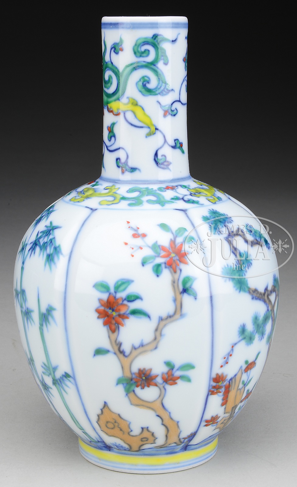 PORCELAIN BOTTLE VASE.20th century, China. Vase with lobated body, tou-tsai decoration of a dragon and flowering trees. 6 character mark on base. SIZE: 6-3/4″ h. CONDITION: Very good. 9-93629 (700-900) – Lot 4430
