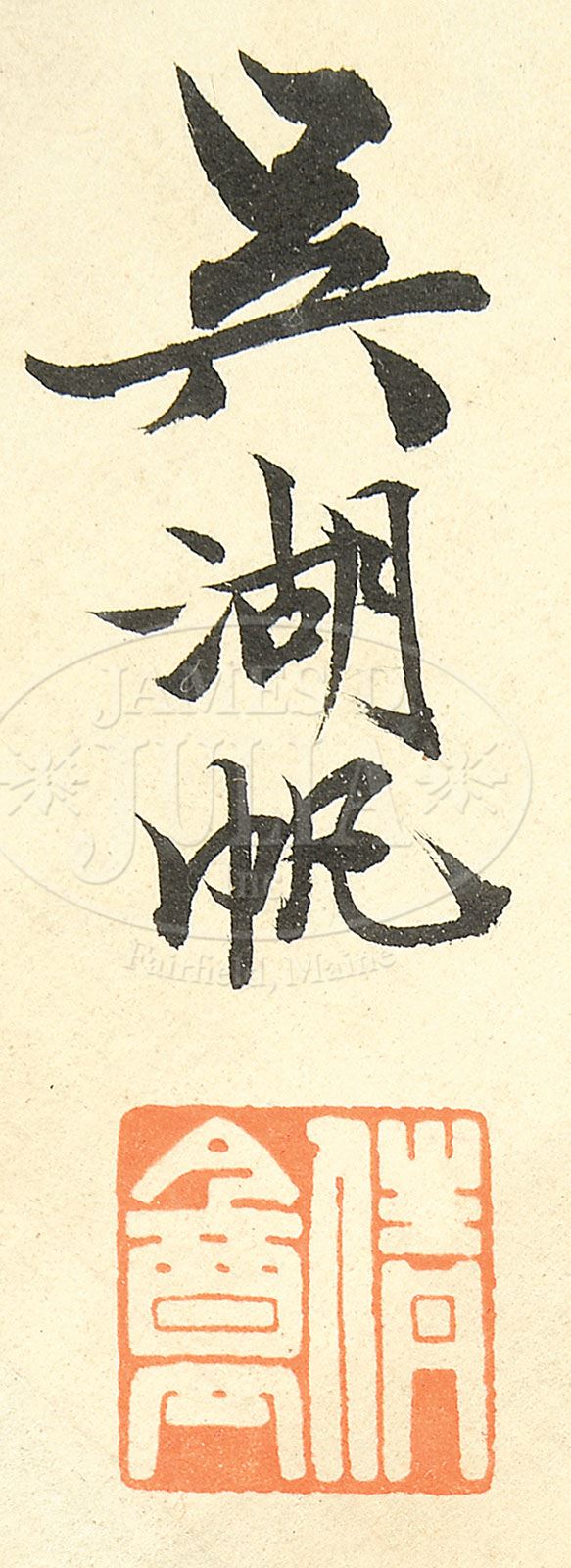 FRAMED FAN CALLIGRAPHY IN THE MANNER OF WU HUFAN. China, cursive script on paper, signed, with one seal, framed and glazed SIZE: 7-1/4″ x 17-1/4″. CONDITION: Minor creases, foxing. 9-91598 (400-600)
