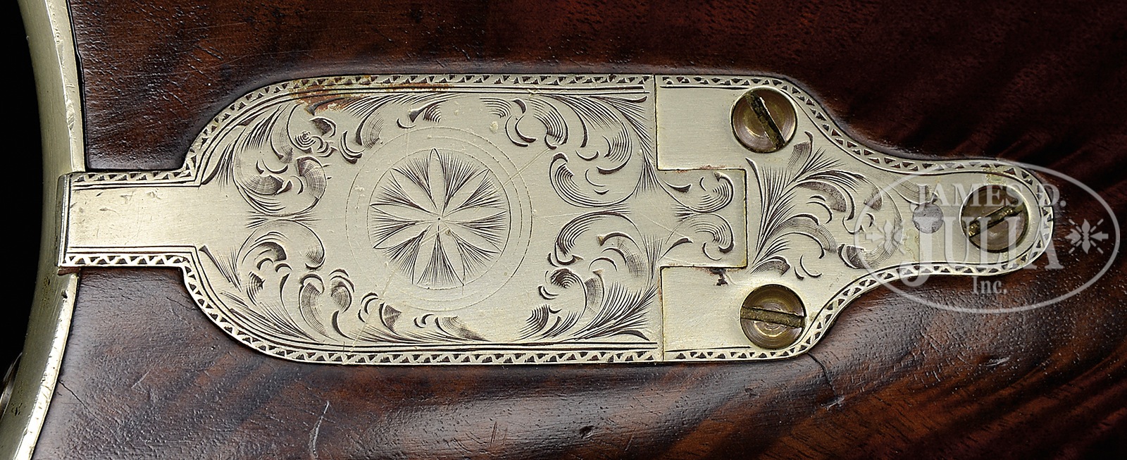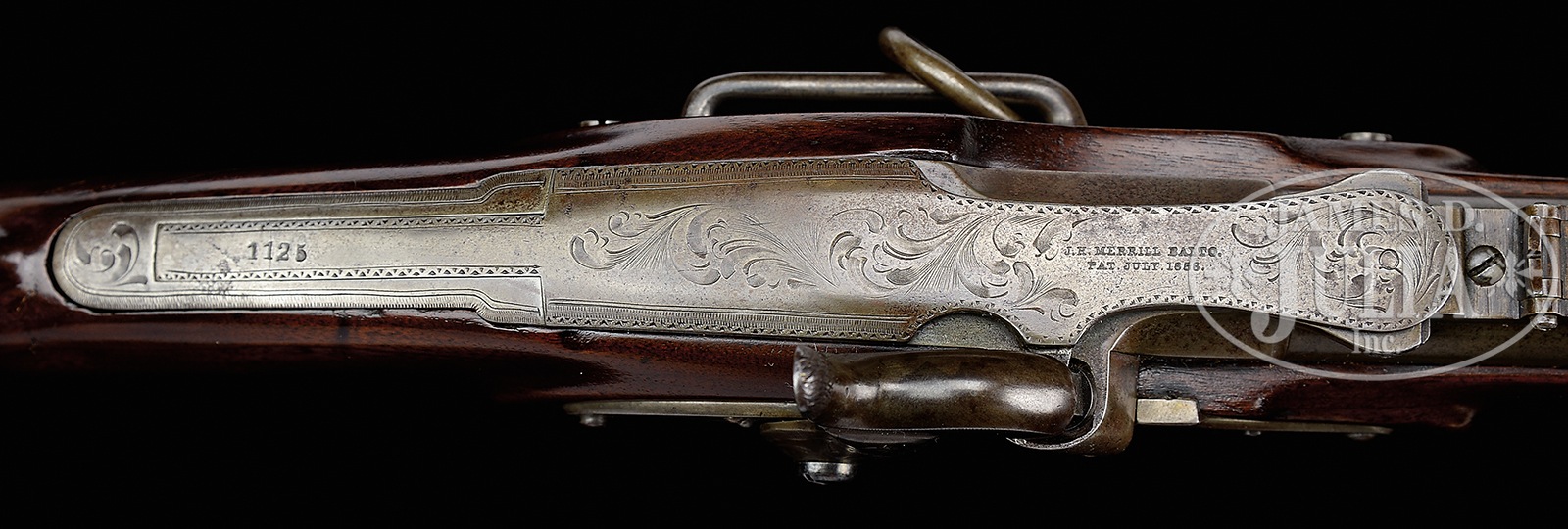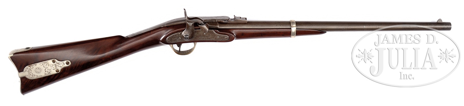 RARE AND UNIQUE CIVIL WAR ENGRAVED MERRILL OFFICER’S MODEL CARBINE, 58 CALIBER.SN 1125. Cal. 58. This is a unique Merrill Officer’s Model and the only one known in 58 Cal., engraved and German silver mounted and once part of the well known Merrill Collection of Bill Moore of Baton Rouge, LA. Often known as officer models, the handful of engraved first model Merrill carbines are quite scarce and all very different. This particular example is totally German silver mounted with flat hinge. Lock, hammer, bbl band, trigger guard, breech, sling bar mounts, buttplate and patchbox are all engraved. Stock is deluxe burled and high polished. Otherwise, this carbine is standard configuration with patent markings on breech and lock with 21-1/2″ browned bbl. This gun is in beautiful condition and is pictured and described in the accompanying privately printed book of Mr. Moore’s collection of Merrill’s on pgs 40-41, (Fig. 18). CONDITION: Very good to fine, orig, complete. Traces of finish in protected areas. Assembly number “13” noted on many parts. Stock is well fit, except around tang where refinished with well disguised professional wrist repair. Markings and engraving all fine and discernible with some wear noted to engraving on trigger bow. Scattered small, cosmetic blemishes. Mechanically functional with crisp bright bore. 51033-30 JS (12,000-15,000) – Lot 4433 Click here to view provenance