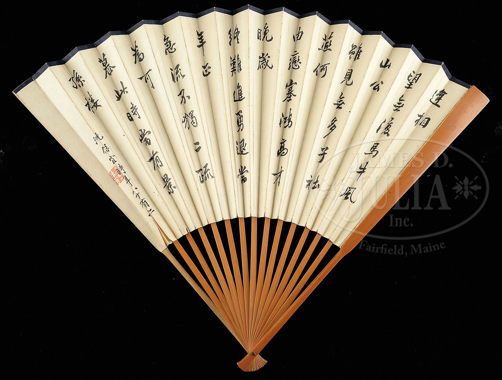 GROUP OF FOUR FANS. 20th century, China. 3 folding fans and one set type. With illustrations and poems. SIZE: Largest 17″ w x 12″ l. CONDITION: Two with damage. 9-91064 (600-800)