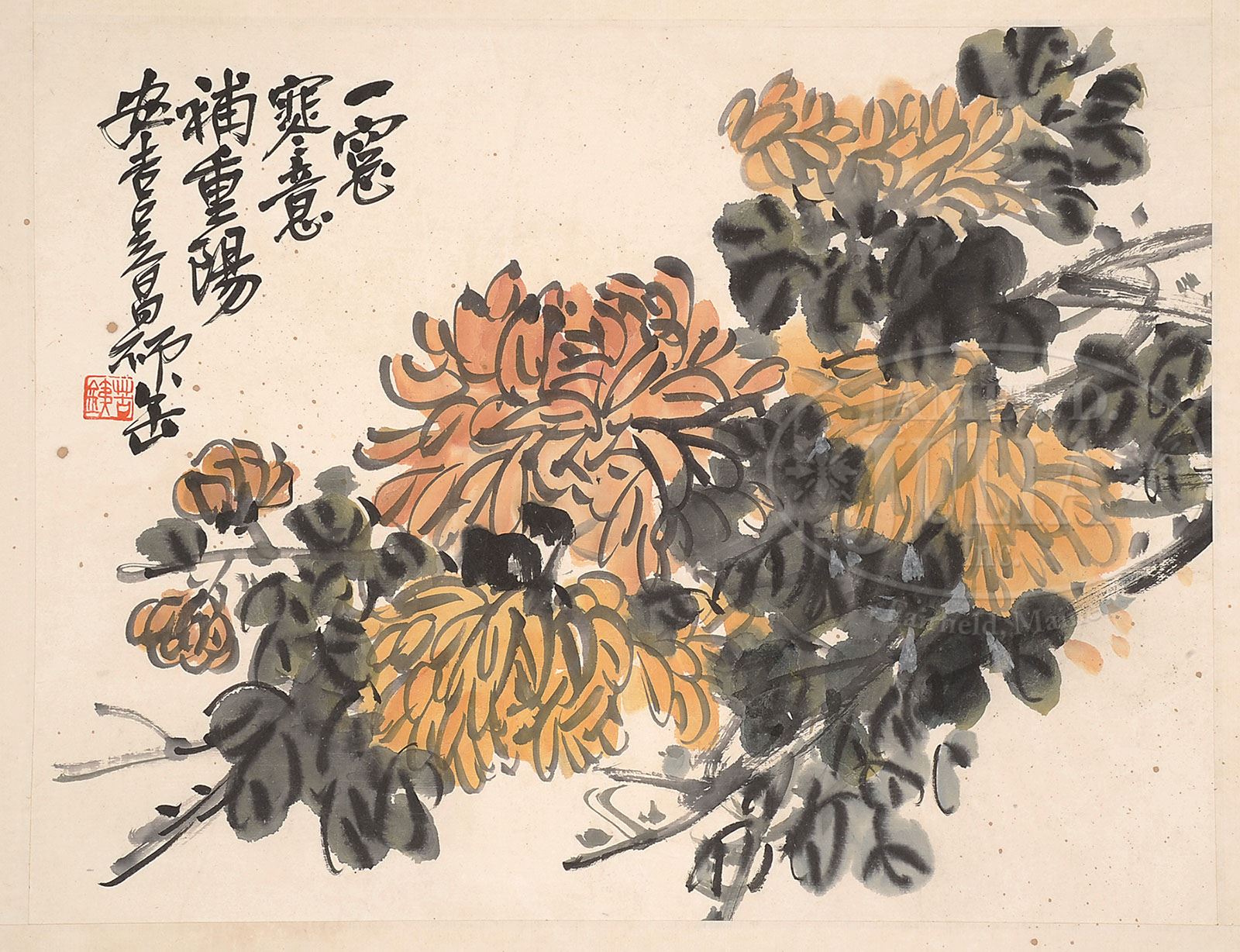 ALBUM LEAVES IN THE MANNER OF WU CHANGSHUO. China, ink and colors on paper, eleven leaves, each depicting fruit or flower branches, inscribed, dated “gengshen year,” signed “Laofou” or “Anji Wu Changshuo,” each with one seal. SIZE: 13″ x 17-1/4″. CONDITION: Good with some foxing. 9-90826 (600-800)